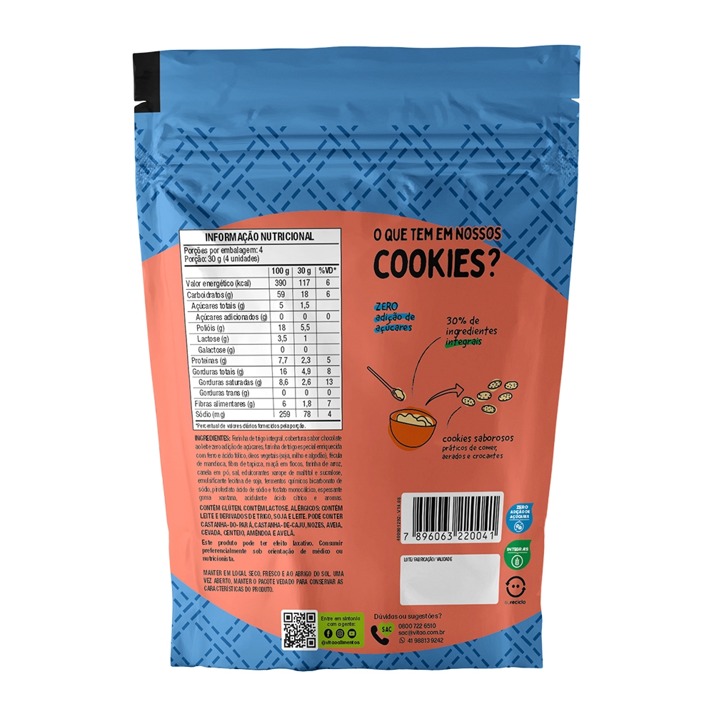Os Cookies Integrais Zero Açúcares de Maçã e Canela com Cobertura de Chocolate é uma união perfeita entre sabor irresistível e cuidado com a saúde. Criados especialmente para quem segue uma dieta sem açúcar ou valoriza um estilo de vida equilibrado, esses cookies combinam ingredientes de alta qualidade para oferecer uma experiência única. INGREDIENTES: Farinha de trigo integral, cobertura sabor chocolate ao leite zero adição de açúcares, farinha de trigo especial enriquecida com ferro e ácido fólico, óleos vegetais (soja, milho e algodão), fécula de mandioca, fibra de tapioca, maçã em flocos, farinha de arroz, canela em pó, sal, edulcorantes xarope de maltitol e sucralose, emulsificante lecitina de soja, fermentos químicos bicarbonato de sódio, pirofosfato ácido de sódio e fosfato monocálcico, espessante goma xantana, acidulante ácido cítrico e aromas. ALÉRGICOS: CONTÉM LEITE E DERIVADOS DE TRIGO, SOJA E LEITE. PODE CONTER CASTANHA-DO-PARÁ, CASTANHA-DE-CAJU, NOZES, AVEIA, CEVADA, CENTEIO, AMÊNDOA E AVELÃ. CONTÉM GLÚTEN. CONTÉM LACTOSE. INTEGRAL, ZERO ADIÇÃO DE AÇÚCARES.