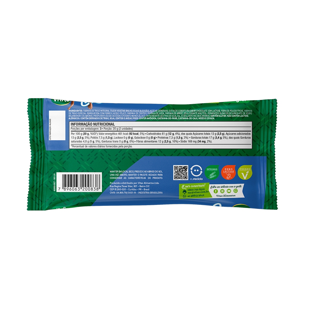 Os cookies integrais sabor baunilha com gotas de chocolate da Vitao são a escolha ideal para quem deseja um lanche ou sobremesa deliciosa e nutritiva. Com 43% de ingredientes integrais, esses cookies oferecem a combinação perfeita entre o sabor suave de baunilha e pedaços generosos de chocolate, criando uma experiência irresistível a cada mordida. Zero lactose, são perfeitos para pessoas com intolerância à lactose, além de serem veganos, atendendo às necessidades de quem segue uma dieta baseada em plantas. Desfrute da textura crocante e do sabor delicioso desses cookies integrais, sem abrir mão do prazer de uma sobremesa saudável e indulgente. Experimente com um café ou chá para um lanche equilibrado. Também podem ser usados como base em receitas de sobremesas como tortas e cheesecakes, adicionando crocância e sabor. INGREDIENTES: Farinha de trigo integral, óleos vegetais (milho, soja e algodão), açúcar demerara, gotas de cobertura sabor chocolate sem lactose, fibra de polidextrose, farinha de trigo especial enriquecida com ferro e ácido fólico, farinha de centeio, farinha de aveia, farinha de arroz, sal, edulcorantes maltitol e xarope de maltitol, fermentos químicos bicarbonato de sódio, bicarbonato de amônio, pirofosfato ácido de sódio e fosfato monocálcico, emulsificante lecitina de soja, acidulante ácido cítrico e aromas. ALÉRGICOS: CONTÉM DERIVADOS DE TRIGO, SOJA, CENTEIO E AVEIA. PODE CONTER AMÊNDOA, CASTANHA-DO-PARÁ, CASTANHA-DE-CAJU E CEVADA. CONTÉM GLÚTEN. NÃO CONTÉM LACTOSE. INTEGRAL, ZERO LACTOSE, VEGANO, FONTE DE FIBRAS.