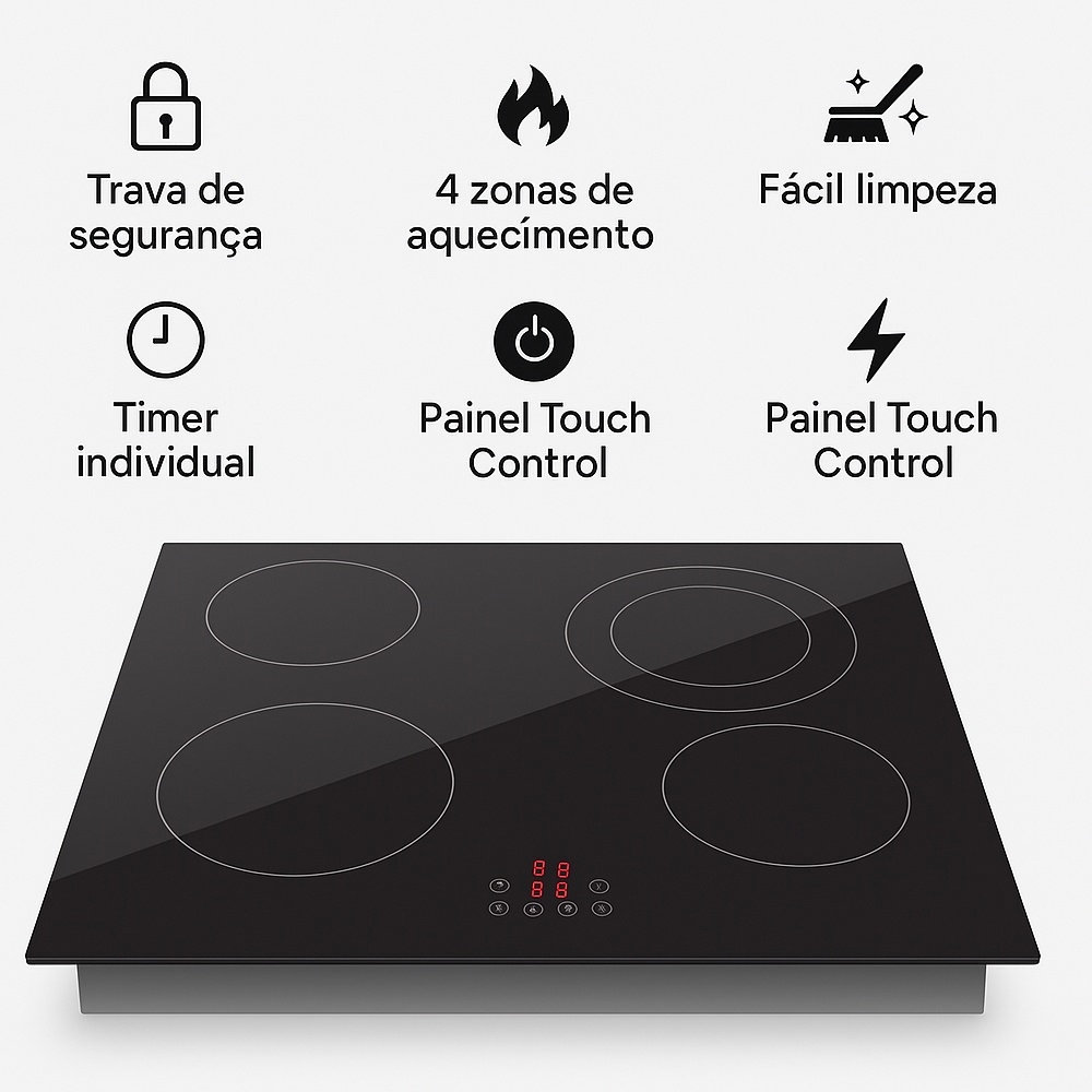 Cooktop Fogão Elétrico Cerâmico Kitchenstar 4 Bocas 60cm Preto, Vidro Cerâmico Chinês, Controle Touch Slider, 220-240V~60Hz, Modelo PC-D46445 1. 4 zonas de aquecimento O cooktop cerâmico Kitchenstar possui 4 bocas ou zonas de aquecimento independentes, permitindo que você cozinhe vários pratos ao mesmo tempo. Isso facilita a preparação de refeições em grandes quantidades ou de pratos diversos simultaneamente, otimizando seu tempo na cozinha. 2. Superfície em vidro cerâmico chinês A superfície de vidro cerâmico chinês oferece durabilidade e resistência a altas temperaturas, além de ser fácil de limpar. Após o uso, basta passar um pano úmido para remover os resíduos, mantendo o cooktop sempre limpo e pronto para o próximo uso. O design elegante também contribui para a estética moderna da sua cozinha. 3. Controle touch slider para ajustes rápidos e precisos Com painel de controle touch slider, o modelo PC-D46445 permite ajustar a temperatura de forma simples e precisa. A interface sensível ao toque facilita o uso, proporcionando uma experiência intuitiva e moderna, ideal para quem busca praticidade no dia a dia. 4. Design moderno de 60cm, ideal para cozinhas planejadas Com 60cm de largura, este cooktop cerâmico foi projetado para embutir facilmente em bancadas de cozinhas planejadas, otimizando o espaço sem perder a funcionalidade. Seu acabamento em vidro preto e o design compacto o tornam perfeito para cozinhas de diversos estilos e tamanhos. 5. Alimentação 220-240V~60Hz para alto desempenho e segurança O modelo PC-D46445 funciona com alimentação de 220-240V~60Hz, garantindo eficiência energética e alto desempenho. O cooktop proporciona aquecimento rápido e uniforme, atendendo às necessidades de cozinhas que buscam desempenho e segurança. Garantia 90 dias