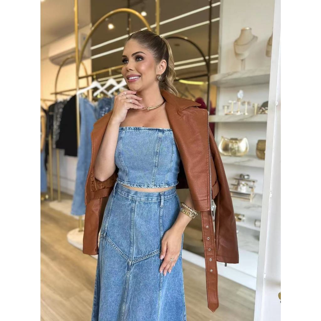 Coolestfeminina 1016+8133 conjunto jeans feminina cropped com saia longa