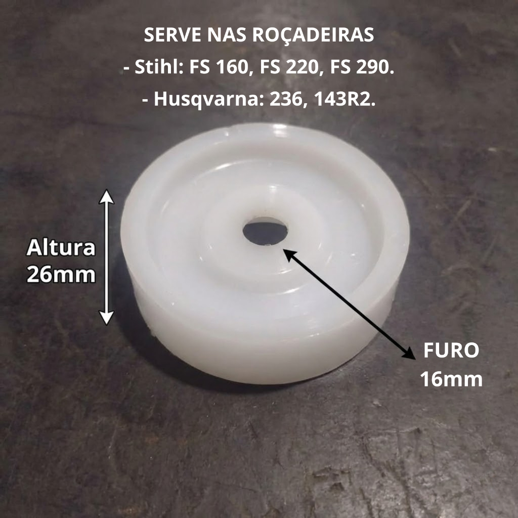 Copinho Limitador de Altura para Stihl e Husqvarna - Furo 16mm 🛡️ Proteção Profissional para sua Roçadeira Proteja a transmissão da sua máquina contra impactos e desgaste prematuro. O Copinho Limitador (Prato Giratório) em Nylon de Alta Densidade evita que a porca e o eixo entrem em contato direto com o solo, garantindo a altura de corte ideal e maior vida útil para o equipamento. ✅ Destaques do Produto: - Compatibilidade Ampla: Atende as principais roçadeiras profissionais do mercado (Stihl e Husqvarna). - Material Reforçado: Nylon de alta resistência, suporta o atrito constante. - Geometria Perfeita: Diâmetro de 8cm que oferece ótima estabilidade no solo sem pesar na máquina. 🛠️ Ficha Técnica: - Diâmetro do Furo Central: 16mm (Verifique esta medida no seu eixo/arruela) - Diâmetro Externo (Largura): 80mm (8cm) - Altura Total: 26mm (2,6cm) - Material: Nylon Branco - Tipo: Limitador de Altura / Prato Giratório 🚜 Modelos Compatíveis: - Stihl: FS 160, FS 220, FS 280, FS 290. - Husqvarna: 143R2, 236R. - Também compatível com outras máquinas que utilizem limitador com furo de 16mm. Benefícios: - Proteção: Evita que a porca da lâmina/carretel entre em contato direto com o solo. - Durabilidade: Material robusto projetado para uso profissional. - Economia: Previne danos caros à transmissão da sua máquina. Dúvida sobre a compatibilidade? Verifique se o eixo da sua roçadeira possui 13mm de diâmetro ou nos envie uma pergunta
