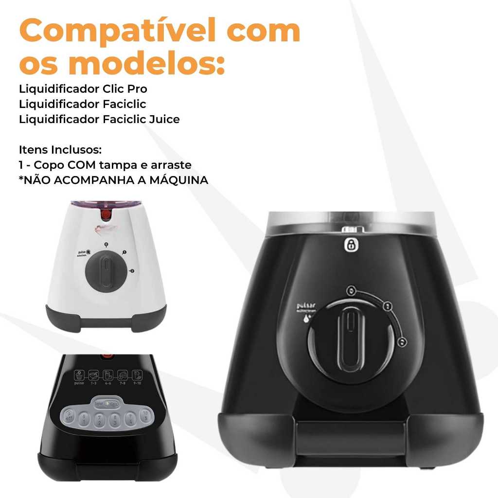 COPO LIQUIDIFICADOR COMPATÍVEL COM ARNO CLIC PRO, FACICLIC E FACICLIC JUICE Apresentamos o Copo de Liquidificador Transparente, feito sob medida para seu Arno Clic Pro, Faciclic e Faciclic Juice. Desenvolvido com material de alta qualidade, esse copo de acrílico durável e transparente vai devolver a vida ao seu aparelho, permitindo que você prepare suas receitas favoritas com toda a segurança e praticidade que merece! Ele já vem completo, com faca de aço inoxidável de 4 dentes para triturar tudo com eficiência, e uma tampa com copo medidor integrado para você acertar na medida sem complicação. É a peça que faltava para otimizar suas receitas! Compatibilidade Perfeita: Projetado para encaixar como uma luva no seu Arno Clic Pro, Faciclic e Faciclic Juice. Material de Alta Qualidade: Acrílico transparente super resistente, feito para durar. Faca de Aço Inox com 4 Dentes: Garante a eficiência que você precisa para triturar e misturar. Copo Medidor na Tampa: Praticidade extra para suas receitas, sem precisar de outros utensílios. Capacidade Ideal: Capacidade 2,0 litros, ideal para bater 1,5 litros, perfeito para todas as suas criações culinárias. Principais Perguntas (FAQ): Esse copo é original da Arno? É um copo paralelo, compatível com o modelo Arno Clic Pro, Faciclic e Faciclic Juice. Nosso produto tem qualidade equivalente ao original. Serve em outros modelos de liquidificador Arno? Não, ele foi projetado especificamente para otimizar as funcionalidades dos modelos Arno Clic Pro, Faciclic e Faciclic Juice. A faca já vem inclusa no copo? Sim, o copo já vem completo com a faca de aço inoxidável de 4 dentes. É fácil de encaixar no liquidificador? Sim, ele é feito para um encaixe perfeito e seguro no seu Arno Clic Pro, Faciclic e Faciclic Juice. Por que comprar com a gente? Entrega rápida e para todo o Brasil: Seu copo novo chega rapidinho pra você não perder tempo! Compra segura: Seus dados protegidos, sua tranquilidade garantida. Garantia na entrega: Seu produto chega perfeito ou a gente resolve! Notas fiscais: Tudo certinho e transparente. Atendimento rápido e com qualidade: Conte com a gente para qualquer dúvida ou imprevisto! Especificações Técnicas: Ficha Técnica: Modelos Compatíveis: Arno Clic Pro, Faciclic e Faciclic Juice Material: Acrílico (Copo), Aço Inoxidável (Faca), Plástico (Tampa) Cor do Copo: Transparente Cor da Tampa: Branco Capacidade Máxima: 2,0 Litros Capacidade Para Bater: 1,5 Litros Itens Inclusos: 1 Copo de Liquidificador Completo (Copo, Faca, Tampa com Medidor) Medidas Aproximadas: Base 9cm x Boca 14,5cm x Altura 25cm Imagens Meramente Ilustrativas.