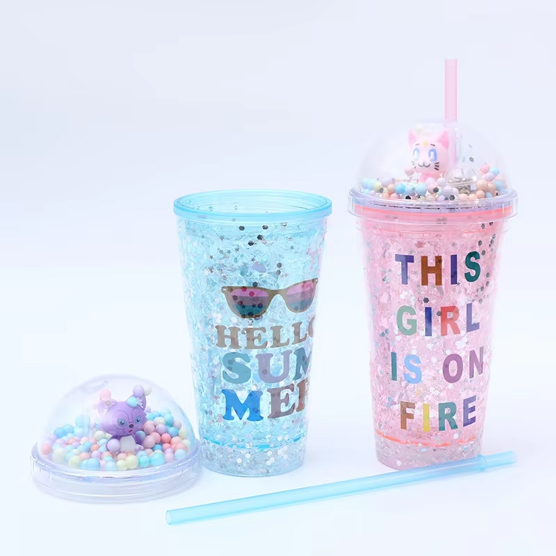 Copo Arco Íris Com LED e Canudo Brilhoso Detalhes na Tampa e Dentro do Copo 450ML