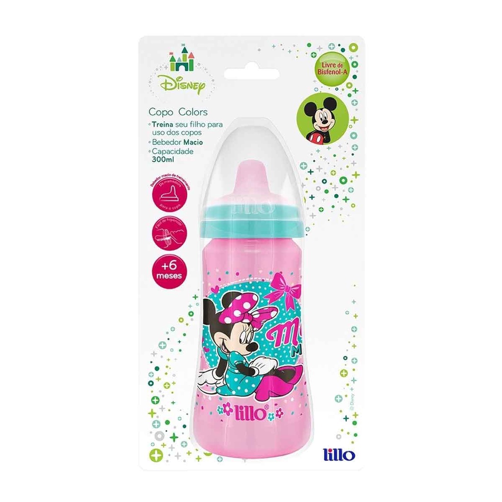 Copo Colors Bico De Silicone Disney Minnie Rosa Lillo Tempos de muitas descobertas e alegrias estão pra começar, e nada melhor do que está preparado neste ciclo de desenvolvimento. O Copo Color da Lillo (300ml),ajuda na migração da mamadeira para o copo ocorrer de forma natural, indicado para bebês acima de seis meses. Seu bico macio em TPE não machuca a boca do bebê. Possuí tampa protetora e disco de vedação antivazamento. Livre de BPA. "O Ministério da Saúde adverte: A criança que mama no peito não necessita de mamadeira, bico ou chupeta. O uso de mamadeira, bico ou chupeta prejudica o aleitamento materno." Principais Características: - Idade Recomendada: Acima de 6 meses - BPA Free - Fácil de limpar e esterilizar. - Cores vibrantes e estampa divertida - Bico macio em TPE  Especificações Técnicas: - Conteúdo da Embalagem: 1 Copos de Transição  - Garantia: 30 Dias Contra defeitos de fabricação Pelo Fabricante - Composição/ Material: Plástico - Dimensões do Produto: 6,7 x 16,0 x 21,0 cm - Referência do Fabricante: 305031 - Código EAN: 7896033231909 - Marca: Lillo  Imagens meramente ilustrativas, as cores e estampas podem variar de acordo com o lote do fabricante