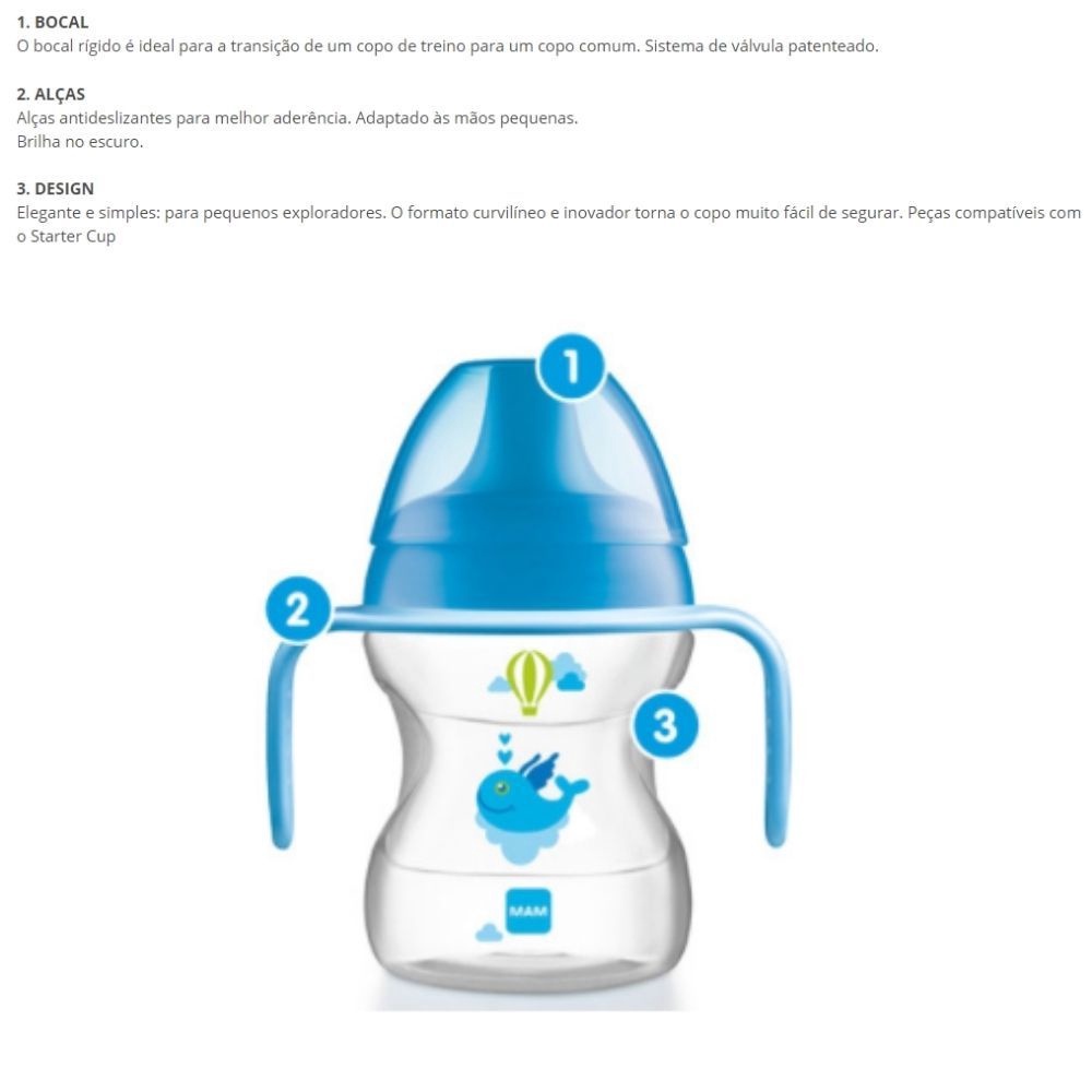 Copo de Transição Fun To Drink Night 270Ml Lilás - MAM Beber sozinho é uma grande diversão com o Copo MAM Fun to Drink Night. Combinando o design e funcionalidade tradicionais da linha MAM, Fun to Drink Night é ideal para ajudar os pequenos na transição do copo treino para os copos comuns. Com bocal rígido, o Copo MAM Fun to Drink possui ainda um sistema patenteado de válvula que permite usar o copo em dois módulos - sem vazamento ou fluxo livre. Alças que brilham no escuro, especialmente desenhadas para as pequenas mãos das crianças. Principais Características: - Idade Recomendada: A Partir de 8 Meses - Antivazamento - Alças que Brilham no Escuro - Bocal: O bocal rígido é ideal para a transição de um copo de treino para um copo comum. Sistema de válvula patenteado. - Alças: Alças antideslizantes para melhor aderência. Adaptado às mãos pequenas. Brilha no escuro. - Design: Elegante e simples: para pequenos exploradores. O formato curvilíneo e inovador tornam o copo muito fácil de segurar. Peças compatíveis com o Starter Cup Especificações Técnicas: - Conteúdo da Embalagem: 1 Copo de transição Fun To Drink Night 270Ml - Composição/Material: Polipropileno - Garantia: 30 Dias (Contra Defeito de Fabricação) - Código do Fabricante: CP51312 - EAN: 9001616802980 - Marca: MAM * Imagens meramente ilustrativas, as cores e estampas podem variar de acordo com o lote do fabricante* "O Ministério da Saúde adverte: A criança que mama no peito não necessita de mamadeira, bico ou chupeta. O uso de mamadeira, bico ou chupeta prejudica o aleitamento materno."