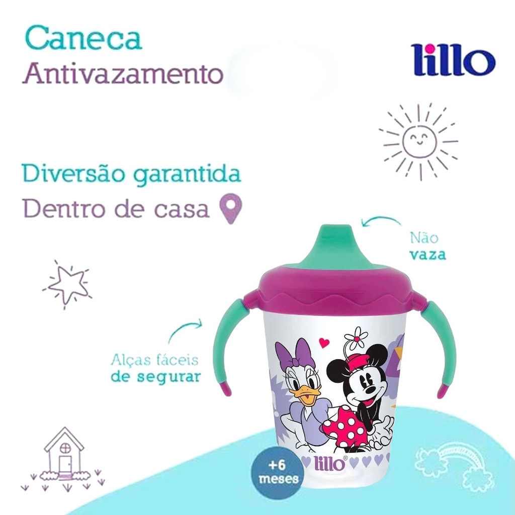 Copo Caneca De Treinamento Antivazamento Disney 207ml Lillo A Caneca Antivazamento Disney Lillo é recomendada para a criança que começa a ingerir líquidos de forma independente. Colabora para que o processo de transição da mamadeira para a caneca ocorra naturalmente. O bebedor possui válvula com sistema antivazamento que impede que o líquido saia sem que a criança sugue, proporcionando a deglutição segura. Alças fáceis de segurar e em material macio que garantem a criança maior segurança ao segurar a caneca. "O Ministério da Saúde adverte: A criança que mama no peito não necessita de mamadeira, bico ou chupeta. O uso de mamadeira, bico ou chupeta prejudica o aleitamento materno." Principais Características: - Idade Recomendada: Acima de 6 meses - Válvula Antivazamento - Com alças - Cores vibrantes e estampa divertida - Modelo: Disney - Capacidade em volume: 207 mL - É antivazamento: Sim Especificações Técnicas: - Conteúdo da Embalagem: 1 Copo de Transição - Produto garantido contra defeito de fabricação - Referência do Fabricante: 305151 - Código EAN: 7896033231626 - Marca: Lillo * Imagens meramente ilustrativas, as cores e estampas podem variar de acordo com o lote do fabricante*