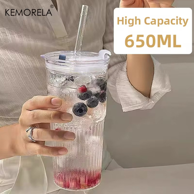 Copo De Vidro Listrado De 600ml , 1/2 Peças , Com Tampa E Canudo , Copos Transparentes Para Suco , Água Café Gelado , Caneca Bebidas