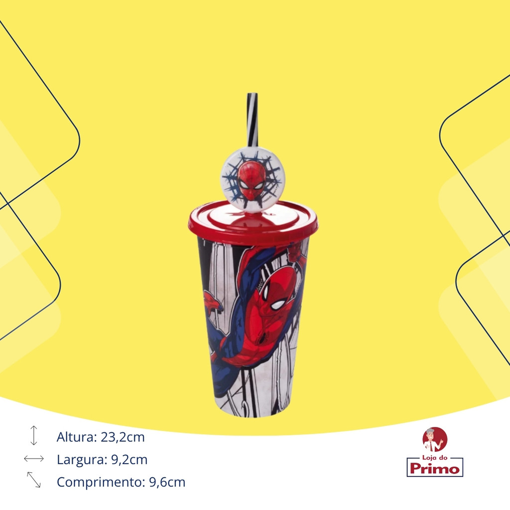 - O copo do Homem Aranha possui 500 ml e é uma ótima opção para crianças e adultos no dia-a-dia. - Com acabamento fosco e textura acetinada ao toque, esse copo possui uma super novidade: o PIN - um acessório charmoso para seu canudo. Aqui, ele possui o rosto do amigo da vizinhança mais famoso das telas. - O PIN fica encaixado na tampa, na abertura do canudo, mas não impede a passagem do líquido pelo mesmo. - Atóxico e livre de bisfenol-A (BPA FREE). Fabricado em plástico polipropileno (PP). - Ideal para presentear e colecionar. Ideal para alegrar a mesa do trabalho ou escritório, ideal para acompanhar a criançada no momento do estudo, hidratação e brincadeiras. Ideal para lembrancinha de aniversário, festas temáticas do personagem e fãs da Disney. - Não sugerimos que seja lavado na lava-louças.