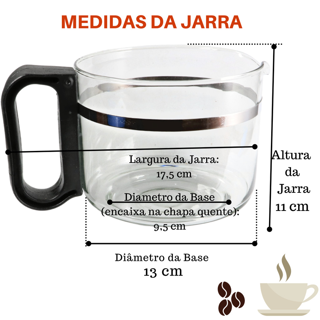 Copo Jarra para Cafeteira Elétrica compatível com a marca WALITA E BRITANIA do modelo BRITANIA CF-28 , WALITA CAFÉ 18, WALITA 24 CAFÉS com a COR BRANCA. Compatível com: Marca: WALITA, BRITANIA Modelo: WALITA CAFÉ 18, WALITA 24 CAFÉS, BRITANIA CF-28 -----MEDIDAS DA JARRA------ Altura da jarra : 11 cm Largura da Jarra: 17,5 cm Diâmetro da Base (encaixa na chapa quente): 9,5 cm Diâmetro da Base: 13 cm CAPACIDADE: 1000 ML #Foto com exemplo das medidas Você receberá: 01 Jarra para Cafeteira Elétrica com alça branca ------Vantagens-------- * Alta qualidade e resistência; * Vidro Reciclado; * O prazer de tomar um delicioso café; * Fazer café de forma rápida e prática com a cafeteira elétrica, sem precisar passar o café no bule. ***DEVOLUÇÃO*** Devolução garantida se não for compatível com sua cafeteira, mas para não ocorrer devolução por favor verifique a marca e modelo da sua cafeteira ou é claro, você pode me mandar suas dúvidas no campo de perguntas que responderei com maior prazer. Não deixe de usar seu eletrodoméstico por falta de algum acessório. Aproveite a praticidade que eles nos proporcionam no dia a dia.