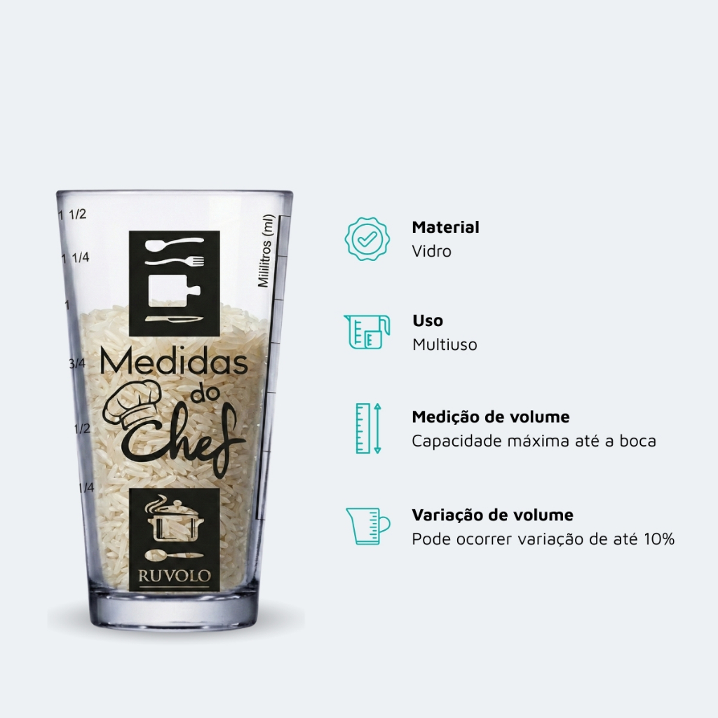 Copo Medidor Vidro Mix Medidas Cozinha Chef Multiuso Resistente Receita 350ml Ruvolo A falta de precisão nas medidas de ingredientes líquidos compromete o resultado final e o padrão de receitas culinárias. O Copo Medidor do Chef Ruvolo resolve este problema através de um corpo em vidro translúcido com marcações de alta legibilidade, garantindo a dosagem exata e a visualização clara do conteúdo para cozinheiros exigentes. Benefícios Principais Este utensílio destaca-se pela fabricação em vidro de alta qualidade, conferindo resistência mecânica e durabilidade superior ao plástico comum. A transparência cristalina facilita a leitura imediata do volume, enquanto a superfície lisa impede a retenção de odores e sabores, assegurando higiene total. Seu design ergonômico oferece firmeza no manuseio diário, sendo uma ferramenta essencial para padronização de preparos. Compatibilidade e Aplicação Produto indicado para uso profissional (chefs, confeiteiros) e doméstico. Aplicável especificamente para a medição de líquidos (água, leite, óleos) e preparação de receitas. Também compatível para servir bebidas. A limpeza deve ser manual com esponja macia para preservar as marcações e o brilho. Especificações Técnicas Produto: Copo Medidor do Chef Material: Vidro Capacidade: 415ml (Volume máximo até a boca) Diâmetro: 80mm (Largura maior da peça) Altura: 146mm Tolerância: Pode sofrer variação de até 10% do volume Observação: Sensível a choque térmico (evitar mudanças bruscas de temperatura). Itens Inclusos 1 Copo de Vidro Medidor do Chef 415ml. Garanta precisão técnica e durabilidade na sua cozinha com a qualidade Ruvolo. Adquira agora e eleve o padrão das suas receitas. Ruvolo A Ruvolo é uma empresa especializada na produção de copos, taças, canecas e outros produtos de utilidade doméstica em vidro e cristal, oferecendo itens funcionais, resistentes e com design pensado para o uso diário. Trabalha com produtos voltados para praticidade, organização e apresentação, atendendo tanto o uso doméstico quanto opções para presente, sempre com foco em qualidade e bom acabamento. Há mais de 100 anos no mercado, a Ruvolo traz excelência e qualidade para a sua mesa. Pensou em vidro, pensou em Ruvolo.