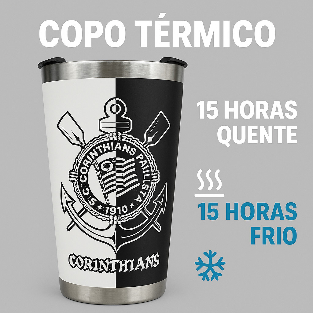 Copo térmico oficial do Corinthians, fabricado em aço inox com isolamento térmico que mantém bebidas quentes ou frias por até 6 horas. Com capacidade de 473ml, tampa com vedação e abridor de garrafas embutido, é ideal para torcedores que gostam de aproveitar o jogo com a bebida na temperatura perfeita. Características: Capacidade: 473ml Material: Aço inox com isolamento térmico Mantém líquidos quentes ou frios por até 6h Tampa com vedação Abridor de garrafas embutido na tampa Fácil de limpar Cabe no porta-copos do carro Estampa Corinthians