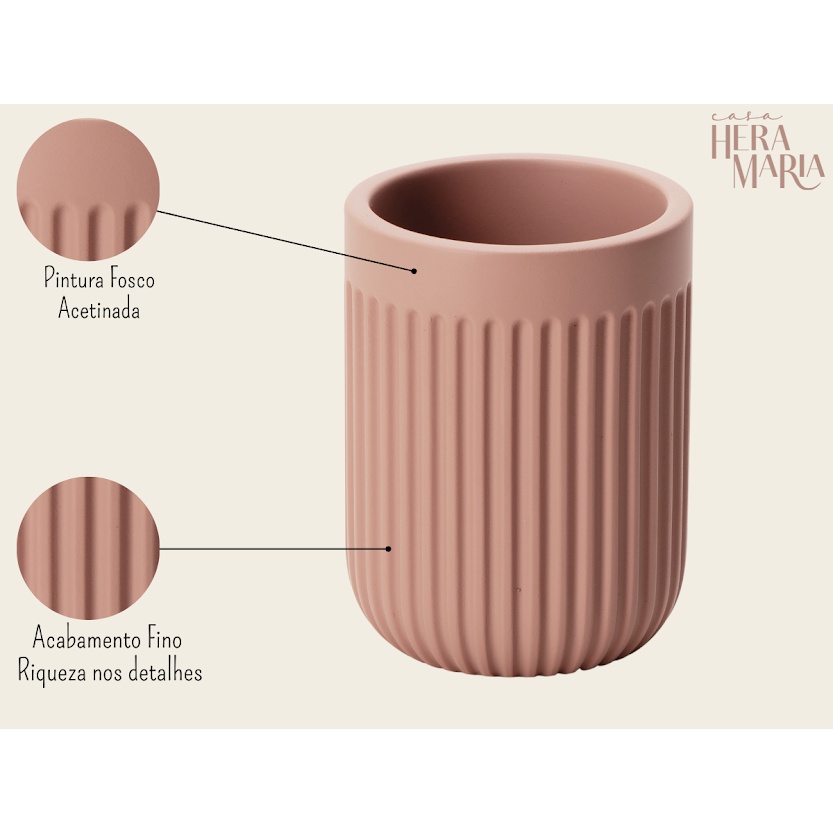 Um ambiente tão importante para o momento do autocuidado também merece um carinho especial! Nosso Copo em Cimento é perfeito para compor com os demais elementos. Pode ser utilizado para abrigar escovas de dentes, pincéis de maquiagem e outros objetos. CARACTERÍSTICAS / MEDIDAS Dimensão: 10 x 7.5 (AxØ) cm Cor: Rose Material: 100% Cimento CONTEÚDO DA EMBALAGEM Contém: Copo Em Cimento CUIDADOS: Manter o produto em local seco e arejado. Quedas e batidas podem causar danos irreversíveis. Não utilizar produtos químicos ou abrasivos na limpeza. #casaheramariadecor#homeheramaria#storeheramaria#portaescovas#suporteescovaslavabo#kitbanheiro#kitbanheirolavabocimento# DÚVIDAS: Se atente a todas as características do produto, olhe as medidas, nome da cor, não se baseie apenas nas fotos e sim não deixe de ver a descrição para evitar comprar um produto que não atenderá sua necessidade, precisando só perguntar. AQUI SEU DINHEIRO É GARANTIDO: Compra 100% segura Se o seu produto chegar danificado, garantimos a devolução do seu dinheiro