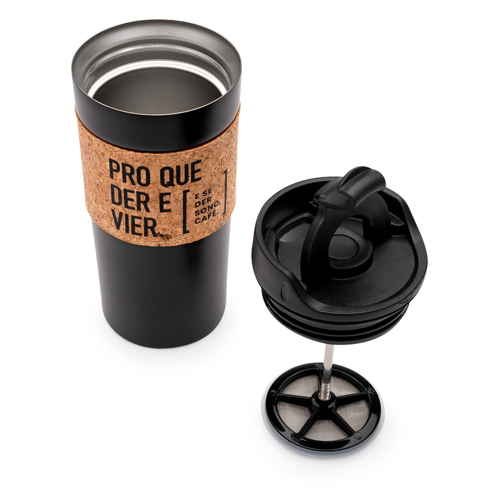 Um copo com 360 ml pro que der, pro que vier (e se der sono café). Mas pode ser um chá também, viu?Porque o sistema prensa francesa é praticamente uma máquina de café portátil e o melhor de tudo é que dá pra beber nela mesmo, pois já é um copo.Não sei o que é mais perfeito: Café ou esse copo. Além disso, possui uma cinta de cortiça para segurar e não aquecer diretamente a mão. Seu mecanismo de prensa é ótimo, pois valoriza o aroma e o sabor do café. Vem ver como funciona: 1. Retire a tampa que possui o disco com filtro; 2. Escolha a mistura de café de sua preferência, adicione 10 gramas ou 2 colheres (sopa) para cada 180 ml. Dica: Existem moagens de café especiais para prensa francesa; 3. Adicione água bem quente (um ponto antes de ferver, entre 90° e 95°). Tampe (sem pressionar a haste) e deixe em infusão por cerca de 5 minutos; 4. Empurre a haste localizada na tampa e, pronto, pode beber! Atenção: Não coloque o produto na geladeira ou no congelador. Não insira bebidas gaseificadas. Antes de tirar ou colocar a tampa, deixe o bocal aberto. Não é à prova de pequenos vazamentos, carregue o produto apenas na posição vertical. Não coloque o produto em mochilas ou bolsas. Choques ou quedas podem danificar o produto. Não é um copo térmico. Este produto não tem vedação térmica, apenas possui uma tampa e parede dupla.