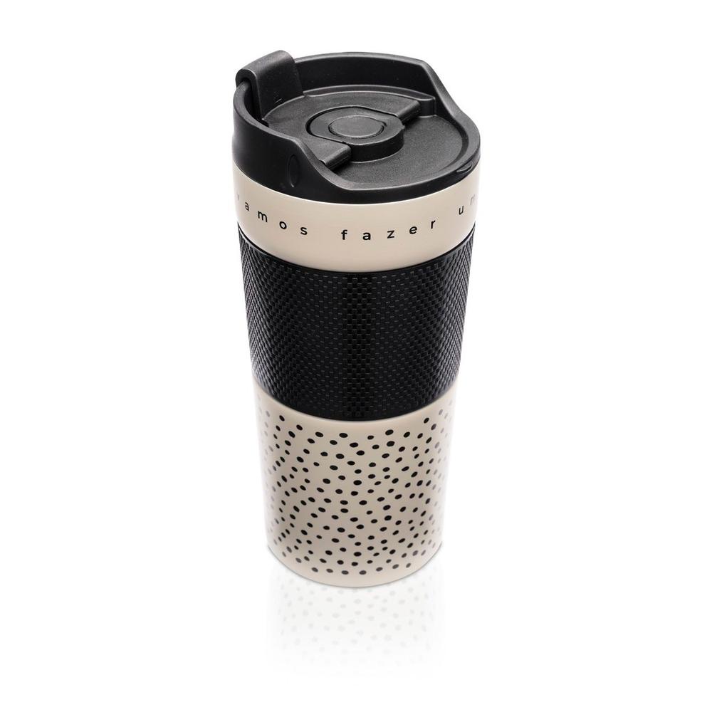 Pra termos um bom dia, primeiro precisamos fazer um bom café, né? O Copo Prensa Francesa Fazer Um Bom Café (360 ml) é praticamente uma máquina de café portátil e o melhor de tudo é que dá pra beber nela mesmo, pois já é um copo. Além disso, possui uma cinta de silicone para segurar e não aquecer diretamente a mão.Seu mecanismo de prensa é ótimo, pois valoriza o aroma e o sabor do café. Vem ver como funciona: 1. Retire a tampa que possui o disco com filtro; 2. Escolha a mistura de café de sua preferência, adicione 10 gramas ou 2 colheres (sopa) para cada 180 ml. Dica: Existem moagens de café especiais para prensa francesa; 3. Adicione água bem quente (um ponto antes de ferver, entre 90° e 95°). Tampe (sem pressionar a haste) e deixe em infusão por cerca de 5 minutos; 4. Empurre a haste localizada na tampa e, pronto, pode beber! Super prático, né?!Agora só adquirir o seu copo prensa francesa e ter um bom dia (ou melhor, bom café)! Contém 1 unidade. Capacidade: 360 ml. Material: Aço inoxidável, plástico e silicone. Obs.: Para utilizar a prensa francesa de forma adequada, dê preferência a cafés especiais de moagem média ou grossa, ou cafés próprios para prensa francesa. Caso seja utilizado com pó de café comum, o produto poderá não funcionar corretamente. Atenção: Não coloque o produto na geladeira ou no congelador. Não insira bebidas gaseificadas. Antes de tirar ou colocar a tampa, deixe o bocal aberto. Não é à prova de pequenos vazamentos, carregue o produto apenas na posição vertical. Não coloque o produto em mochilas ou bolsas. Choques ou quedas podem danificar o produto. Não é um copo térmico. Este produto não tem vedação térmica, apenas possui uma tampa e parede dupla.