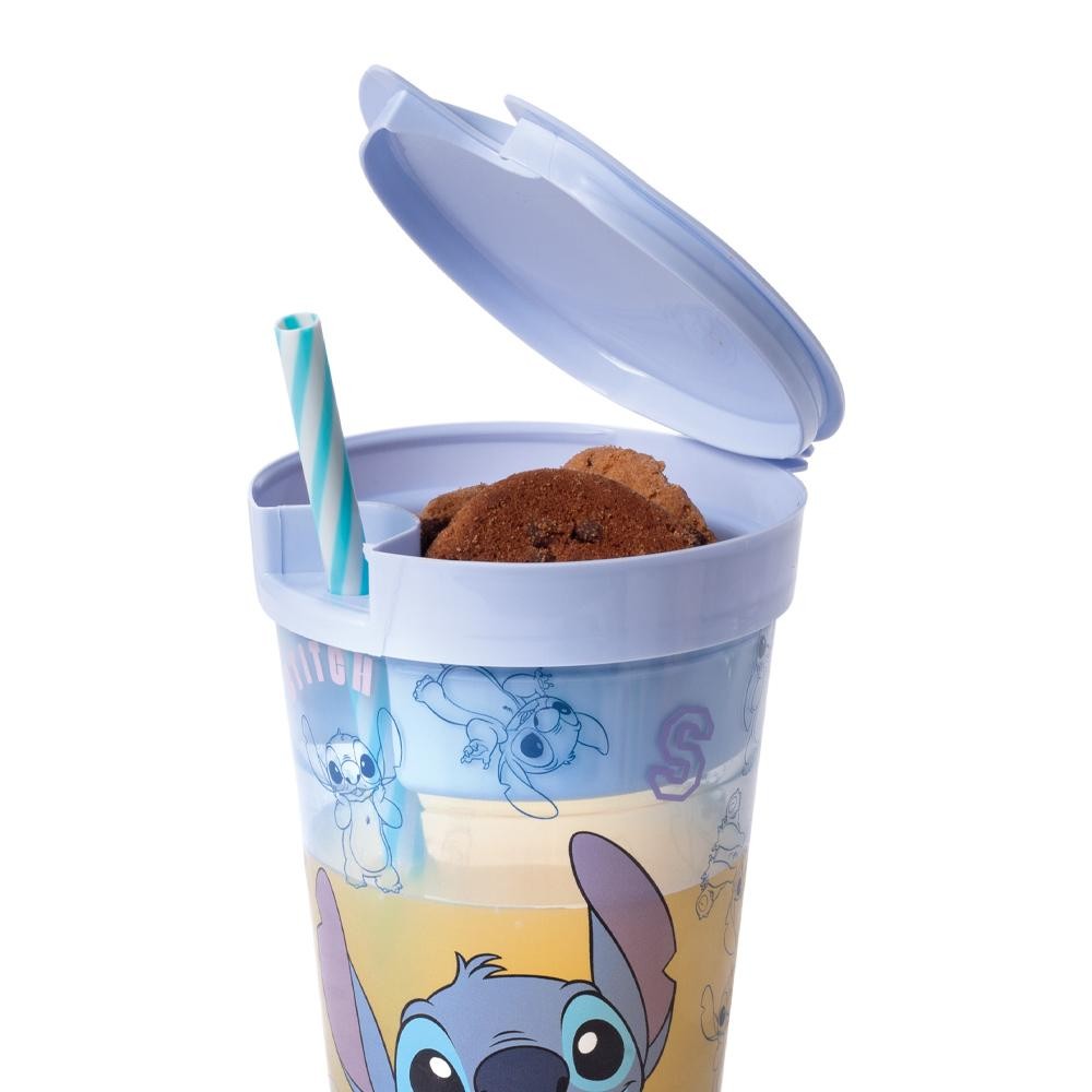 Copo Stitch Canudo com Compartimento Pote Plástico Plasútil Dimensao: (Comp x Larg x Alt): 10,6x10,3x22,5 cm Capacidade: 540,0 ml - O copo com compartimento e canudo faz muito sucesso entre as crianças pois ele possui um espaço secreto! Isso mesmo! A tampa é um compartimento pote onde eles podem colocar snacks, frutas ou lanchinhos. - Perfeito para hora da hidratação, estudos e brincadeiras. - Tamanho compacto com espaço extra. - Compartimento: 220 ml. Copo: 540 ml. - Fabricado em plástico polipropileno (PP). Atóxico e livre de bisfenol-A (BPA FREE)..