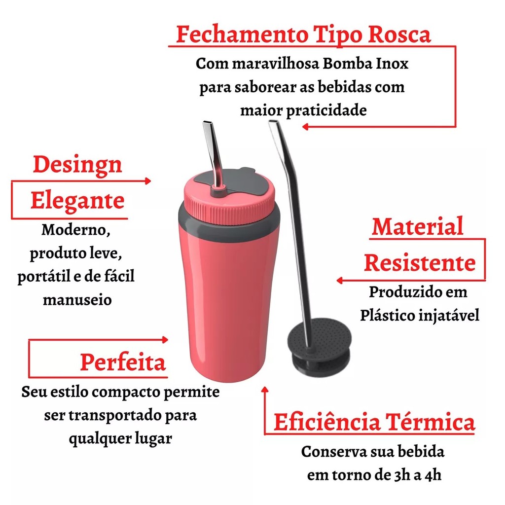 Desfrute as suas bebidas na temperatura ideal para consumir em casa, em uma caminhada ou ao ar livre. Feito com os melhores materiais e alta qualidade, este produto transformará seus momentos relaxantes em momentos inesquecíveis. O Copo Térmico Tererê é ideal para preservar todo o sabor e temperatura da sua bebida favorita, de forma prática, confortável e segura. Além disso, possui uma tampa exclusiva e bomba em inox, que permite você beber com mais praticidade. Livre de BPA Por ser isento de Bisfenol A, um componente químico muito comum na fabricação de plásticos, permite que o produto seja usado com tranquilidade e segurança. Temperatura ideal por horas O sistema de isolamento de parede dupla mantém as bebidas a uma temperatura constante, por mais tempo, sem preocupações. Aviso legal • Não contém BPA. Capacidade: 650 ml Peso: 0,22 Kg Dimensões: 94 x 93 x 266 mm Material: Isolamento em PU (Poliuretano) e demais peças em plástico injetado (PP). DÚVIDAS? ESTAMOS À DISPOSIÇÃO!!!