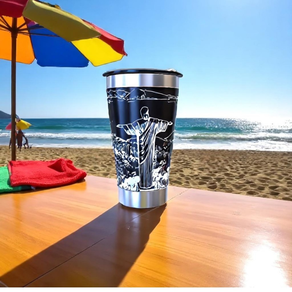 Copo Térmico 360º graus Personalizado a Laser Tema: Rio de Janeiro 473ML Com tampa e abridor parede dupla PRESENTE