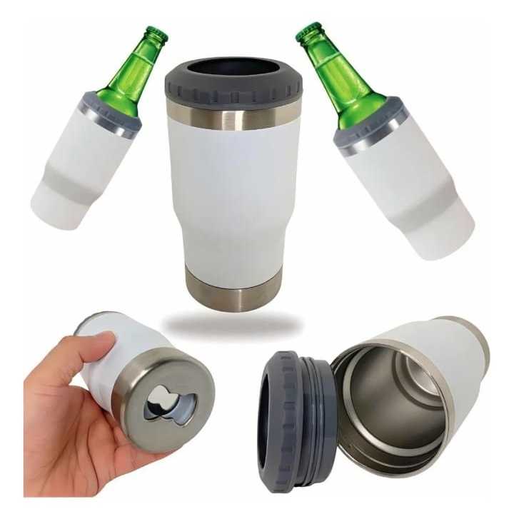 Copo Térmico 5 em 1 Porta Lata, Porta Long Neck Capacidade 420 ML 5 em 1 Porta Long NecK Porta Lata Padrão 350ml Porta Lata Palito 269ml Porta Garrafinha 300ml Copo Térmico com Tampa 400ml Abridor de Garrafas Mantém sua bebida por até 4 horas gelada Mantém sua bebida por 1 hora quente Feito de Aço Inox 304, Parede Dupla, Isolamento à Vácuo e uma tampa suporte pra se adequar ao que você bebe, deixando sua lata ou long neck sempre firme no copo. ITENS INCLUSOS: - 1 Copo térmico - 2 Tampas