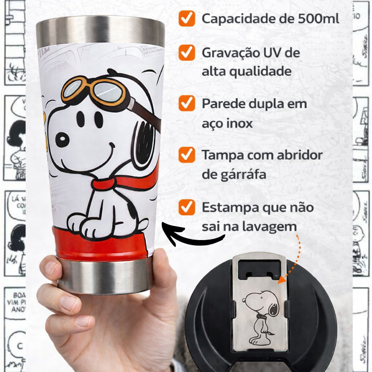 Copo Térmico 500ml Aço Inox Snoopy 360 Gravado UV Mantém Bebida Gelada Alta Qualidade Premium