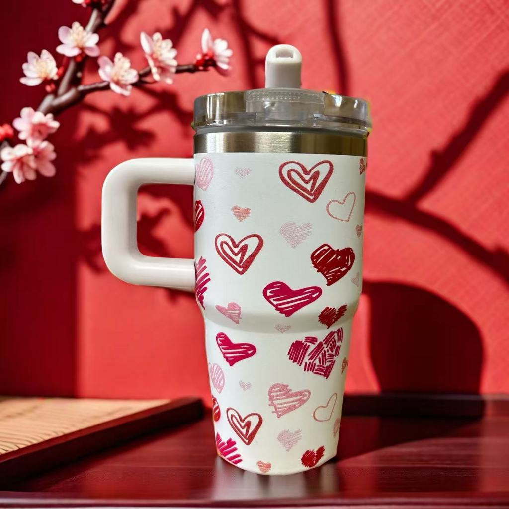 Copo Térmico 600ML com Alça e Canudo – Estampa de Corações