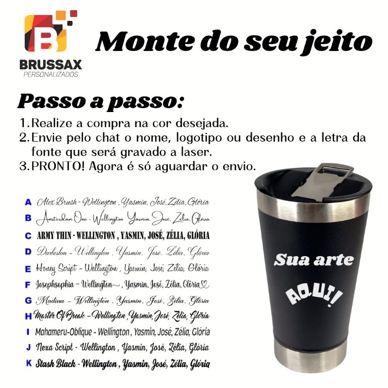 Copo Térmico Personalizado Nome, Time, Logo - 473ml A experiência perfeita, AGORA PERSONALIZADA A LASER! Mantenha sua bebida sempre gelada ou quente por horas com este incrível Copo Térmico de 473ml, feito especialmente para quem valoriza sabor e praticidade. Ideal para curtir momentos com amigos, churrascos, festas ou até mesmo relaxar em casa, ele combina design funcional e estilo moderno. Por que escolher este copo? ✅ Isolamento térmico eficiente: mantém sua bebida gelada ou quente por mais tempo. ✅ Acessório completo: inclui uma tampa à prova de respingos. ✅ Abridor integrado: nunca mais perca tempo procurando um abridor — ele já vem embutido! ✅ Material resistente e durável: produzido com aço inoxidável de alta qualidade, resistente a impactos e fácil de limpar. ✅ Possui isolamento a vácuo: o que faz o copo não transpirar na parte externa. ✅ Capacidade ideal: 473ml, o tamanho perfeito para sua bebida favorita. ✅ Personalizado com logo e nome: você terá um copo exclusivo, gravado a laser com seu nome e o logotipo que preferir. Design pensado para você Com um formato ergonômico, este copo se encaixa confortavelmente na mão e cabe na maioria dos porta-copos de veículos. Além disso, seu acabamento premium oferece um visual elegante, que combina com qualquer ocasião. Presente perfeito Surpreenda amigos, familiares ou até mesmo os colaboradores de sua empresa com um item PERSONALIZADO que eles realmente irão usar e adorar. Seja no Natal, aniversários ou datas especiais, o Copo Térmico é sempre uma ótima escolha! Garanta o seu agora mesmo e aproveite momentos únicos com praticidade ao seu alcance! Clique em “Compre Agora” e leve essa novidade para casa! Instruções para gravação: 1. Assim que a compra for confirmada, entre em contato através do chat para enviar as instruções de gravação (nome, fonte, direção da gravação). 2. Assim que recebermos as instruções, o designer entrará em contato para confirmação da solicitação. Fique atento ao chat, pois todo o contato é feito por ele. 3. O designer finalizará a arte e enviará para aprovação. Somente após aprovação fará a gravação a laser. Novamente, fique atento ao chat. IMPORTANTE: A Brussax Personalizados preza pela qualidade de seus produtos e deseja lhe dar uma excelente experiência de compra, portanto, esteja atento a algumas regras: 1. Toda a personalização e envio acontece em até 24h úteis. Esteja atento ao chat que é o meio de comunicação do designer com o cliente. 2 .Se a loja não receber em até 24h úteis as instruções para gravação o produto será enviado sem a personalização. 3 .Se a loja não receber a aprovação da arte dentro das 24h úteis, será enviado sem a personalização.