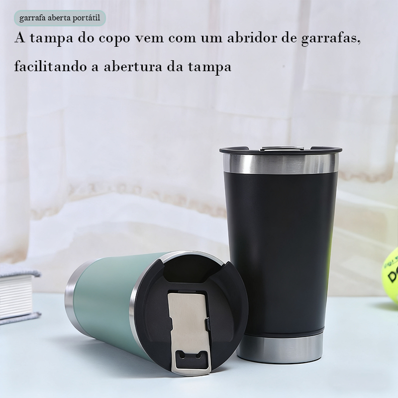 Copo Térmico de Cerveja 473ml Com Tampa e Abridor de Garrafas Para Cerveja / Refrigerante Alta Qualidade Copo Inox