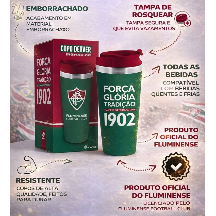 Presenteie aquele seu amigo ou amiga Tricolor com esse charmoso Copo Térmico Emborrachado, para que ele/a possa apreciar sua bebida favorita com muito estilo e praticidade, além de demonstrar todo seu amor pelo time do coração. Sua tampa possui duas formas de abertura (rosqueável e abre-fecha), conservando a temperatura da bebida por mais tempo. Pode conservar bebidas quentes por até 2h e bebidas frias por até 3h. Os produtos da marca Brasfoot tem parceria com Fluminense Football Club, garantindo produtos de qualidade e OFICIALMENTE LICENCIADOS, com selo oficial do clube. Características que combinam com a funcionalidade, conforto e durabilidade de produtos emborrachados: 1. Toque suave e agradável: Sensação tátil suave e agradável ao toque, o que os torna confortáveis de segurar e manusear; 2. Resistência ao deslizamento: A superfície emborrachada geralmente é antiderrapante, o que ajuda a segurar o produto com firmeza; 3. Proteção contra impactos: A borracha é um material flexível e resiliente, o que torna os produtos emborrachados umas mais resistentes a impactos e quedas; 4. Isolamento térmico: A borracha também possui propriedades de isolamento térmico, o que significa que produtos emborrachados podem ajudar a manter a temperatura; 5. Resistência à água e à umidade: A borracha geralmente é resistente à água e à umidade, o que torna os produtos emborrachados adequados para uso em ambientes úmidos ou sob chuva; 6. Facilidade de limpeza: A superfície emborrachada é geralmente fácil de limpar, muitas vezes requerendo apenas água e sabão neutro; 7. Estilo e aparência: A borracha pode ser moldada em diferentes formas e estilos, o que permite uma variedade de designs e cores para atender às preferências estéticas. Características: Altura: 17,5 cm; Comprimento: 7,5 cm; Largura: 8 cm; Capacidade: 450 ml. Contém 1 copo Cuidados: Lavar com água e sabão neutros e evitar usar o lado áspero da esponja; Não usar produtos químicos e abrasivos; Choques e quedas podem danificar o produto; Não hermeticamente vedado. Para evitar vazamentos, faça o transporte sempre na vertical. Aviso legal • Não contém BPA.
