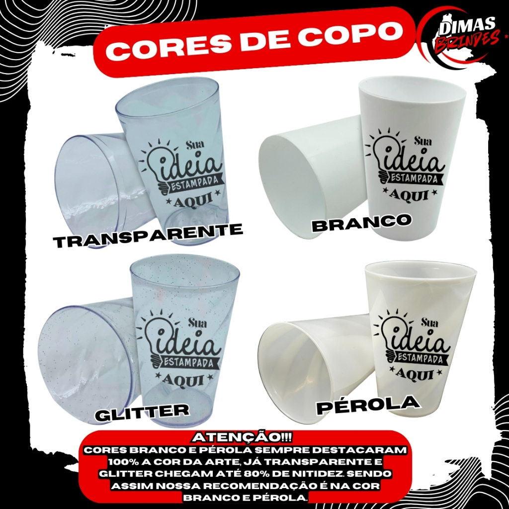 __DIMAS BRINDES__ Personalização Feita Direto no Copo. (NÃO É ADESIVO, NÃO SAI COM AGUA!!!!) Copo personalizado para diferenciar seu evento, desenvolvemos temas infantis, adultos, poll party, casamentos, 15 anos, logo de empresa, dia das crianças, chá de panela, chá revelação, balada, chá de bebê, batizado, formatura e muito mais....... DESENVOLVEMOS TODOS OS TEMAS! (OU LOGO) ***COPOS COM 1 NOME DIFERENTE EM CADA COPO TERÁ ACRÉSCIMO DE 2$ POR COPO*** *ARTE SOMENTE DE 1 LADO. PARA PERSONALIZAR O OUTRO LADO ACRÉSCIMO DE 1,50$ POR COPO.* ***No copo branco ou pérola a impressão da arte fica 100% visível e em copos translúcidos atinge até 80% de visibilidade, chegando a 100% quando estão sob uma base de cor sólida como no copo branco ou pérola, assim como as imagens de divulgação.*** APÓS EFETUAR A COMPRA CLIQUE EM "ENVIAR MENSAGEM AO VENDEDOR" E INFORME O TEMA, NOME E A IDADE QUE DESEJA NA ARTE. CASO NÃO SEJA ENVIADO OS DADOS ATE O ULTIMO DIA DE PRODUÇÃO OS COPOS SERÃO ENVIADO SEM A PERSONALIÇÃO!!! ENVIAREMOS A ARTE PARA APROVAR EM ATÉ 4 DIAS ÚTEIS. Dúvidas Frequentes: Posso pedir a arte cada um com um nome ou tema ? Infelizmente não, somente 1 arte por kit. Para mais artes terá acréscimo de 1$ por Copo. Como enviar os dados para a arte ? Após a efetivação da compra, clicar em enviar mensagem ao vendedor e informar os dados da arte ou Logo. Qual o prazo para envio ? O produto é enviado em no máximo 7 dias após a compra. (NÃO TEMOS ACESSO AO PRAZO DE ENTREGA PARA O COMPRADOR SOMENTE O PRAZO DE POSTAGEM) Faz arte em branco ? Infelizmente não. (O Maquinário de impressão não possui tinta branca, sendo assim teremos como adaptar a arte no copo branco devido o fundo ser branco.) Posso escolher mais de uma cor de tampa ou copo ? Sim, pode mesclar as cores de copo e tampa no mesmo pedido dependendo da quantidade de cores. Como vem embalado o produto ? Todos os copos vão embalado em um saquinho plástico e sobreposto para evitar quebras e etiquetado como FRÁGIL. ( Embalagens somente para transporte) Estamos à disposição para esclarecer todas as dúvidas. ATENDIMENTO DE SEG A SEXTA (EXCETO FERIADOS) DAS 11h as 17h!!! (POR GENTILEZA AGUARDA O RETORNO) VERIFIQUE SE A DATA DE ENTREGA É COMPATÍVEL COM A DATA DO EVENTO. NÃO COMPREM EM CIMA DA HORA, VERIFIQUEM SEMPRE O ULTIMO DIA PREVISTO DE ENTREGA. NÃO TEMOS ACESSO AO PRAZO QUE O PEDIDO SERÁ ENTREGUE, SOMENTE O CLIENTE CONSEGUE CONFERIR O PRAZO CALCULANDO COM O CEP NO ANÚNCIO OU APÓS A COMPRA NO STATUS DA COMPRA. SEMPRE CONSIDERAR O ÚLTIMO DIA DO PRAZO!!! PARA PEDIDOS COM PRODUÇÃO EXPRESSA SERA COBRADO UMA TAXA DE 20$ PARA ADIANTAR A PRODUÇÃO (CONSULTAR VIA CHAT COM O VENDEDOR) Os itens são enviados em perfeitas condições, caso chegue ao destino alguma peça quebrada devido o mal manuseio da transportadora. NÃO NOS RESPONSABILIZAMOS POR ATRASOS NO TRANSPORTE. NÃO NOS RESPONSABILIZAMOS POR QUEBRAS NO TRANSPORTE. Garantia: Caso receba alguma peça danificada pelo transporte, ressarciremos o valor referente a unidade mediante a comprovação com foto em até 24 horas do recebimento. Não será possível a reposição. ESPECIFICAÇÕES: MATERIAL DO COPO:PS CRISTAL ALTURA: 13/14CM DIAMETRO DA BOCA:7,5CM DIAMETRO DA BASE:5,2CM PESO:35/39G IMPRESSÃO A TRANSFER LASER