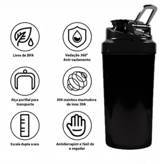 A coqueteleira 1 dose preta , é um acessório prático e indispensável para sua suplementação e hidratação antes,durante e após os treinos, e também em outros momentos da rotina agitada do dia a dia. AQUI VOCÊ SÓ TEM VANTAGENS Facilidade no manuseio Mistura mais homogênea Limpeza fácil Praticidade de uso e transporte À prova de vazamentos Boca larga Gravação de mililitros em relevo Livre de FTALATO Livre de BPA DICAS DE USO - Não recomendado uso no Micro-ondas ou temperaturas acima 55°C - Apto para lava-louças - Não lavar com esponjas abrasivas ou ásperas PERGUNTAS FREQUENTES PERGUNTA: A coqueteleira vem com marcações laterais da medidas em ML? RESPOSTA: Sim, a coqueteleira acompanha marcações laterais em ML . PERGUNTA: Eu posso usar o shaker sem a esfera? RESPOSTA: Sim pode, a esfera é apenas um facilitador para misturar bebidas. PERGUNTA: A garrafa vem com filtro/peneira ? RESPOSTA: Sim, este modelo vem com filtro. PERGUNTA: A garrafa vem com a esfera misturadora ? RESPOSTA: Sim, a garrafa acompanha sim uma esfera misturadora. Itens Inclusos - 1x Coqueteleira 600ml Garrafa Academia - 1x Esfera Misturadora - 1x Peneira Filtro