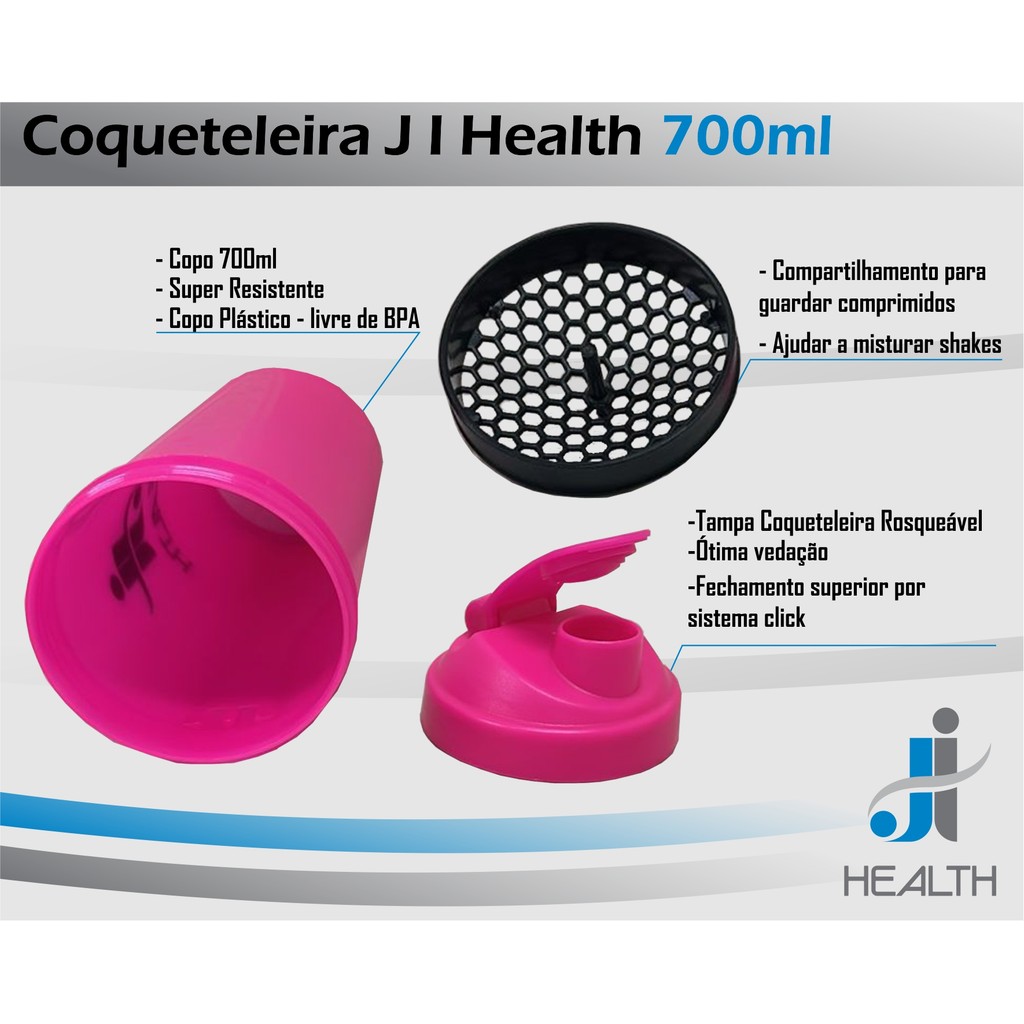 Coqueteleira J I Health 700ml Uma coqueteleira feita pensando em facilitar a vida do usuário. Ideal para usar com nossa linha de Suplementos da J I Health. Esta coqueteleira possui capacidade de até 700ml, a capacidade ideal para dissolver diversos tipos de suplementos da J I Health. Pensando em cada detalhe de uso e até mesmo em sua saúde, essa é uma coqueteleira de plástico livre de BPA, com o material muito resistente e duradouro. A tampa dessa coqueteleira de plástico é rosqueável, com ótima vedação, o fechamento da parte superior da tampa é feito por sistema de click, com muita facilidade e ótima vedação. Ela conta também com um compartimento para que você possa guardar suplementações em comprimidos/cápsulas e além disso auxilia na hora de fazer a mistura do líquido com o pó. Cada detalhe desta coqueteleira foi feito pensado em facilitar o seu uso, tornando a sua experiência de treino ainda melhor. Proporcionando durabilidade devido ao material de ótima qualidade, além de muito estilo durante o seu treino. Aproveite sua coqueteleira para usar com nosso delicioso Whey 3 em 1 Health Whey 720g. Nele você encontrará tudo o que precisa para seu treino de alta performace. Whey 3 em 1 da Health Whey possui na mesma fórmula de 720g, Whey Protein Concentrado, Creatina Monohidratada e Glutamina. Aproveite para visitar nossa loja aqui na plataforma e conhecer toda nossa linha de produtos.