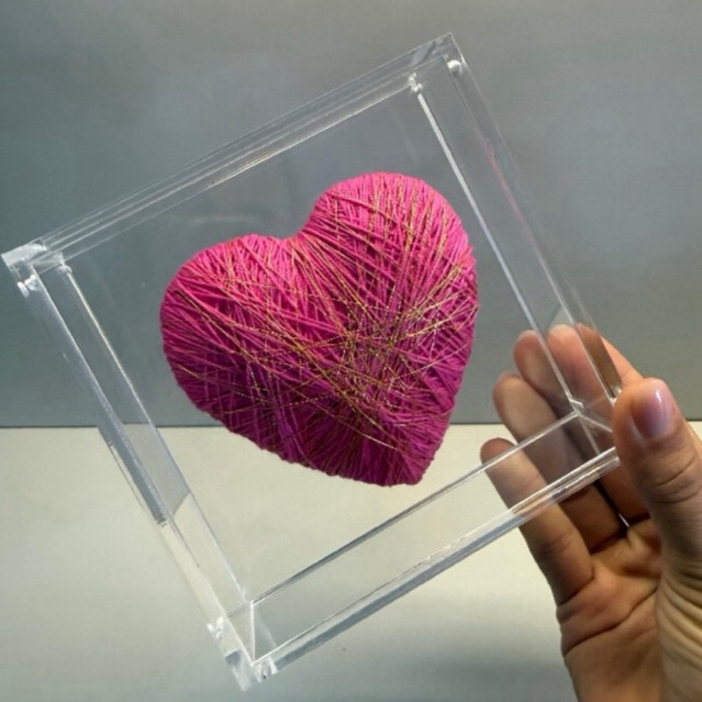 Coração de fio artesanal PINK na caixa de acrílico 12x12x4