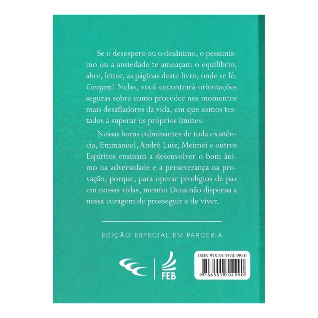 A doença atinge o corpo então sadio. Um grande afeto abandona-nos o coração. O desemprego surge em nosso caminho. Se o desespero ou o desânimo, o pessimismo ou a ansiedade, te ameaçam o equilíbrio, abre, leitor, as páginas deste livro, onde se lê: Coragem! Em 50 mensagens, pela psicografia de Francisco Cândido Xavier, você encontrará orientações seguras de como proceder nos momentos mais desafiadores da vida, em que somos testados a superar os próprios limites. Nessas horas culminantes de toda existência, Emmanuel, André Luiz, Meimei e outros sábios Espíritos nos ensinam a desenvolver o bom ânimo na adversidade e a perseverança na prova, porque, para operar prodígios de paz em nossas vidas, mesmo Deus não dispensa a nossa coragem de seguir e de viver.