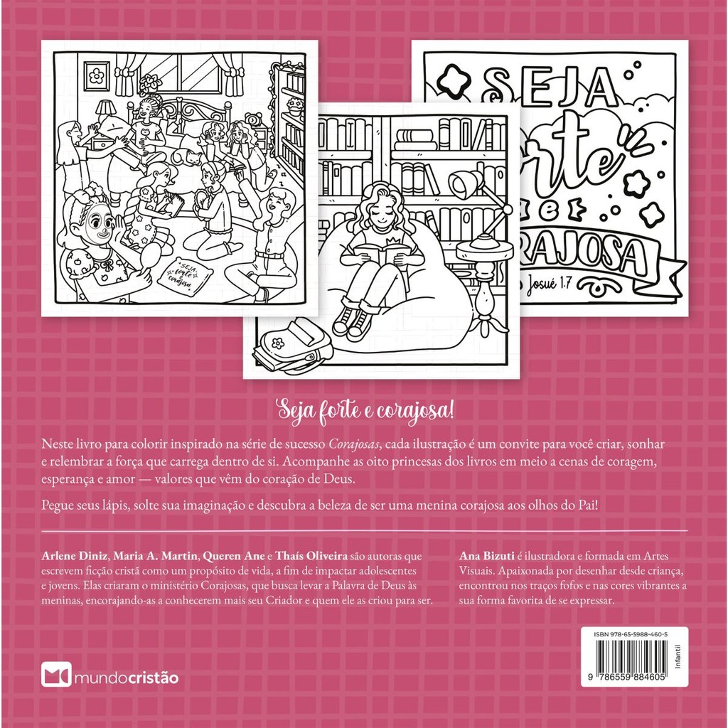 Corajosas Para colorir | As princesas nada encantadas As princesas cresceram e agora vão colorir com você! Corajosas para colorir leva fé e criatividade às mãos das meninas. Desdobramento da série best-seller Corajosas: os contos das princesas nada encantadas, o novo livro Corajosas para colorir chega às livrarias com uma proposta lúdica e edificante: incentivar a criatividade das meninas por meio de ilustrações que expressam coragem, fé e esperança. Autor: Arlene Diniz, Maria S. Araújo, Queren Ane, Thaís Oliveira Editora: Mundo Cristão Acabamento: Capa comum brochura Dimensões: 23 cm larg. x 23 cm alt. Número de páginas: 48 ( 24 ilustrações )