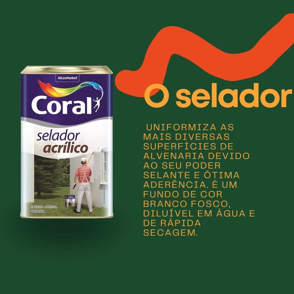 SELADOR ACRILICO CORAL 18LTS **ATENÇÃO! SÓ É PERMITIDO O ENVIO DE 1 UNIDADE POR PEDIDO. CASO DESEJE UMA QUANTIDADE SUPERIOR, FAÇA COMPRAS SEPARADAMENTE** ..................................................................................................................................... DESCRIÇÃO DO PRODUTO ..................................................................................................................................... Para proteger e manter sua pintura bonita e nova por muito mais tempo é necessário fazer uma boa preparação da superfície. Indicado para paredes novas, o Selador Acrílico impermeabiliza e uniformiza as mais diversas superfícies de alvenaria devido ao seu poder selante e ótima aderência. É um fundo de cor branco fosco, diluível em água e de rápida secagem. Com grande poder de preenchimento e cobertura, pode ser aplicado em ambientes internos e externos e prepara a superfície para os demais cuidados que sua parede necessita. Uma lata de 18L pinta até 100m² por demão. Materiais de aplicação Rolo de lã, pincel ou trincha. ..................................................................................................................................... ESPECIFICAÇÕES DO PRODUTO ..................................................................................................................................... MATERIAIS DE APLICAÇÃO Rolo de lã de pelo baixo, pistola, pincel ou trincha ..................................................................................................................................... CARACTERÍSTICAS DO PRODUTO ..................................................................................................................................... -Acabamento: Fosco -Rendimento 90 m² ~~Secagem~~ -Ao toque: 30min -Entre demãos: 4h -Final: 5h -Número de demãos : 1 -Alto poder selante -Alta aderência .................................................................................................................................. LOJA .................................................................................................................................. O grupo SOLUWAN atua neste mercado há mais de 30 anos, possuindo loja física e online. Com 30 anos de história procuramos atender nossos clientes com agilidade, competência, ética e honestidade. Vendemos somente produtos novos e de qualidade garantida. Despachamos em até 24 horas. Entregamos para todo o Brasil. .................................................................................................................................. DÚVIDAS FREQUENTES .................................................................................................................................. Pergunta: Como é embalado o produto? Resposta: Todos os nossos produtos vendidos são embalados em caixas lacradas ou plástico stretch. Em respeito ao meio ambiente 90% das caixas são reutilizadas. Pergunta: Quem faz a entrega? Resposta: A entrega é terceirizada, feita via CORREIOS ou TRANSPORTADORA. Pergunta: O envio é feito em quantos dias? Resposta: Nós enviamos o seu pedido no prazo máximo de 24 horas após a confirmação de sua compra, sendo um dos envios mais rápidos da plataforma. Pergunta: Os produtos são novos ou usados? Resposta: Todos os produtos que trabalhamos são novos e com qualidade garantida. ..................................................................................................................................... #suvinil#tintabranca18litros#tintasuvinilbranca#tintalavavel#tintadeparedelavavel#tintasuvinil18litroslavavel#tintaoleo18litros#tintarecuperadaesmalte18 litros#tintasuvinilelefante18litros#tintaparede18l