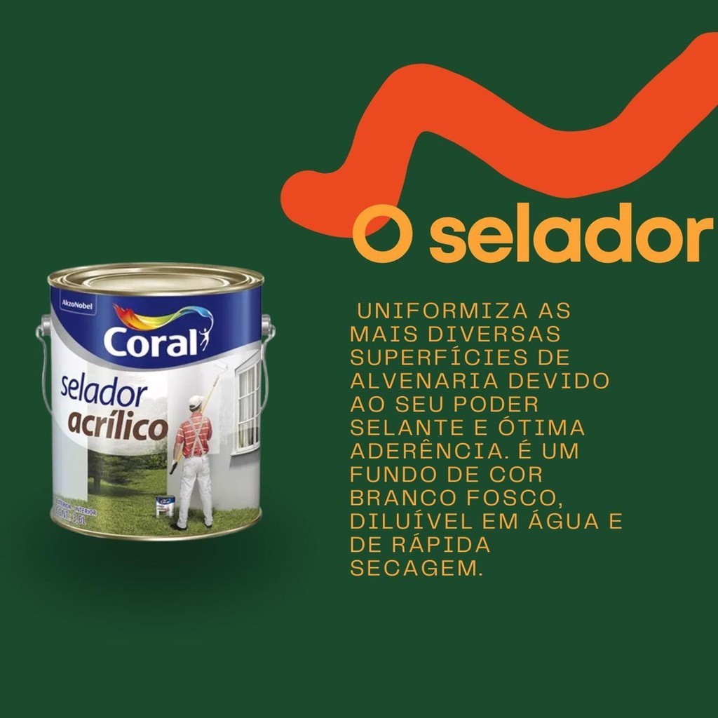 CORAL - Selador 3,6 L DESCRIÇÃO DO PRODUTO Para proteger e manter sua pintura bonita e nova por muito mais tempo é necessário fazer uma boa preparação da superfície. Indicado para paredes novas, o Selador Acrílico impermeabiliza e uniformiza as mais diversas superfícies de alvenaria devido ao seu poder selante e ótima aderência. É um fundo de cor branco fosco, diluível em água e de rápida secagem. Com grande poder de preenchimento e cobertura, pode ser aplicado em ambientes internos e externos e prepara a superfície para os demais cuidados que sua parede necessita. Uma lata de 18L pinta até 100m² por demão. Materiais de aplicação Rolo de lã, pincel ou trincha. ..................................................................................................................................... MATERIAIS DE APLICAÇÃO Rolo de lã de pelo baixo, pistola, pincel ou trincha ..................................................................................................................................... CARACTERÍSTICAS -Acabamento: Fosco -Rendimento 5 m²/L -Secagem : -Ao toque: 30min -Entre demãos: 4h -Final: 5h -Número de demãos : 1 -Alto poder selante -Alta aderência .................................................................................................................................. LOJA .................................................................................................................................. O grupo SOLUWAN atua neste mercado há mais de 30 anos, possuindo loja física e online. Com 30 anos de história procuramos atender nossos clientes com agilidade, competência, ética e honestidade. Vendemos somente produtos novos e de qualidade garantida. Despachamos em até 24 horas. Entregamos para todo o Brasil. .................................................................................................................................. DÚVIDAS FREQUENTES .................................................................................................................................. Pergunta: Como é embalado o produto? Resposta: Todos os nossos produtos vendidos são embalados em caixas lacradas ou plástico stretch. Em respeito ao meio ambiente 90% das caixas são reutilizadas. Pergunta: Quem faz a entrega? Resposta: A entrega é terceirizada, feita via CORREIOS ou TRANSPORTADORA. Pergunta: O envio é feito em quantos dias? Resposta: Nós enviamos o seu pedido no prazo máximo de 24 horas após a confirmação de sua compra, sendo um dos envios mais rápidos da plataforma. Pergunta: Os produtos são novos ou usados? Resposta: Todos os produtos que trabalhamos são novos e com qualidade garantida. .....................................................................................................................................