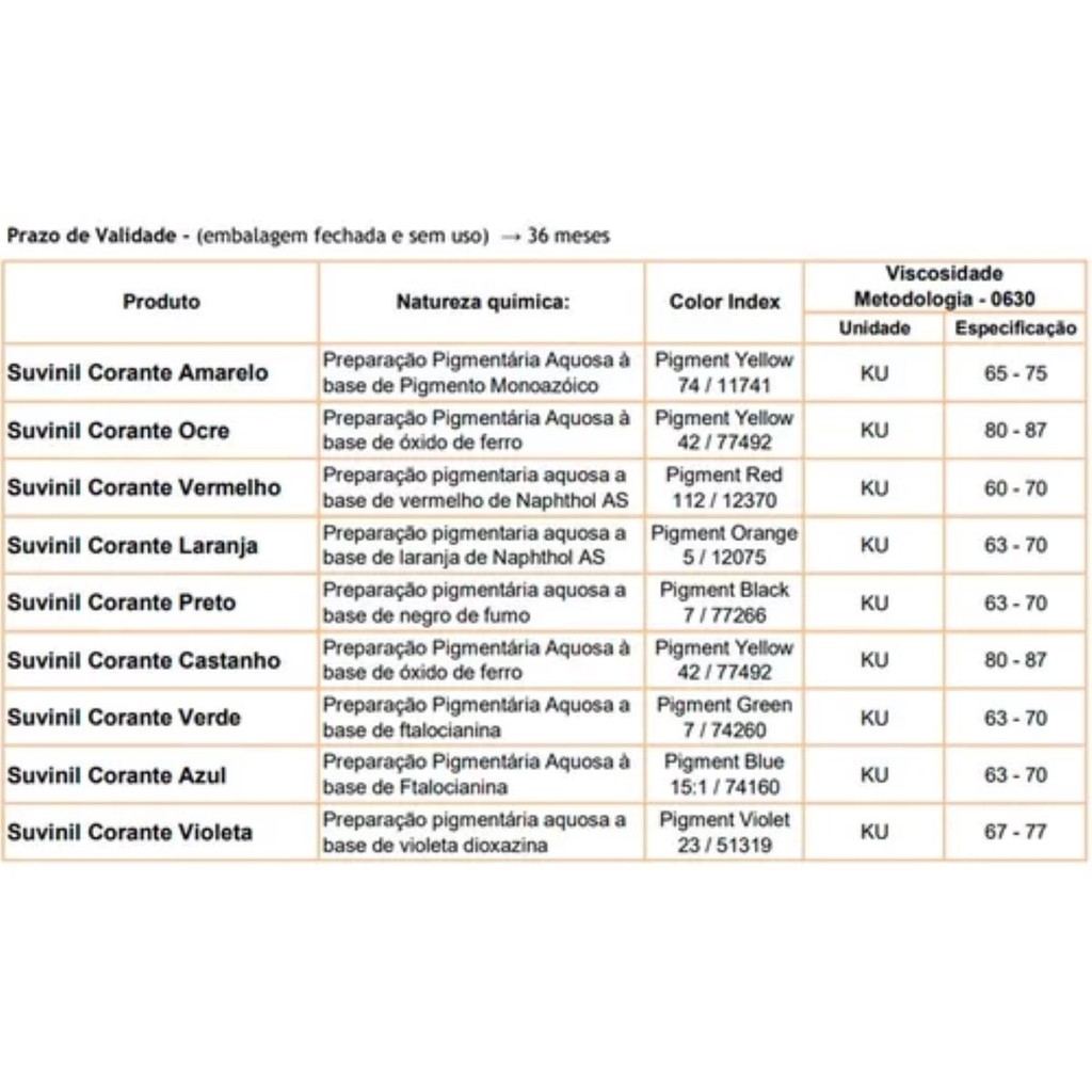 CORANTE LÍQUIDO 50ML SUVINIL Suvinil Corantes são produtos versáteis. Eles podem ser misturados a tintas decorativas à base de água, brancas ou coloridas, para que você chegue à cor desejada. Indicado para tingir tintas látex à base de água – PVA e Acrílica. Disponível em várias tonalidades, que combinadas possibilitam a obtenção de milhares de cores. EMBALAGEM: • 50ml APLICAÇÕES: • Paredes / Exterior • Paredes / Interior DILUIÇÃO: • Produto pronto para uso; não diluir. COMO APLICAR: • Agitar o corante antes de usar adicionando-o aos poucos à tinta, sempre sob agitação, até atingir a cor desejada. DICA: • Para cada galão de tinta (3,6L), use apenas 1 bisnaga. Adicione o corante aos poucos e mexa até alcançar a cor desejada. Antes de aplicar, teste a cor em um papel branco. Lave o bico antes e depois do uso. CORANTE LIQUIDO 50ML SUVINIL - KIT C/4 UNIDADES