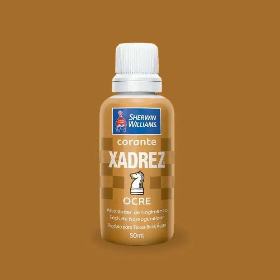 Corante Líquido Xadrez O Corante Líquido Xadrez é um pigmento de alto poder de tingimento e resistência, ideal para colorir tintas decorativas à base de água (látex e acrílicas). Cores Disponíveis: Amarelo, Azul, Laranja, Marrom, Ocre, Preto, Violeta, Verde e Vermelho. Modo de Uso: Para cada 3,6 litros de tinta, adicione até um frasco (50ml) do corante, misturando bem antes e durante a aplicação. É possível misturar diferentes corantes entre si para criar novas tonalidades. Embalagem: Disponível em frascos de 50ml. Benefícios: Fácil de homogeneizar e com alto poder de tingimento, permitindo a criação de uma vasta gama de cores.
