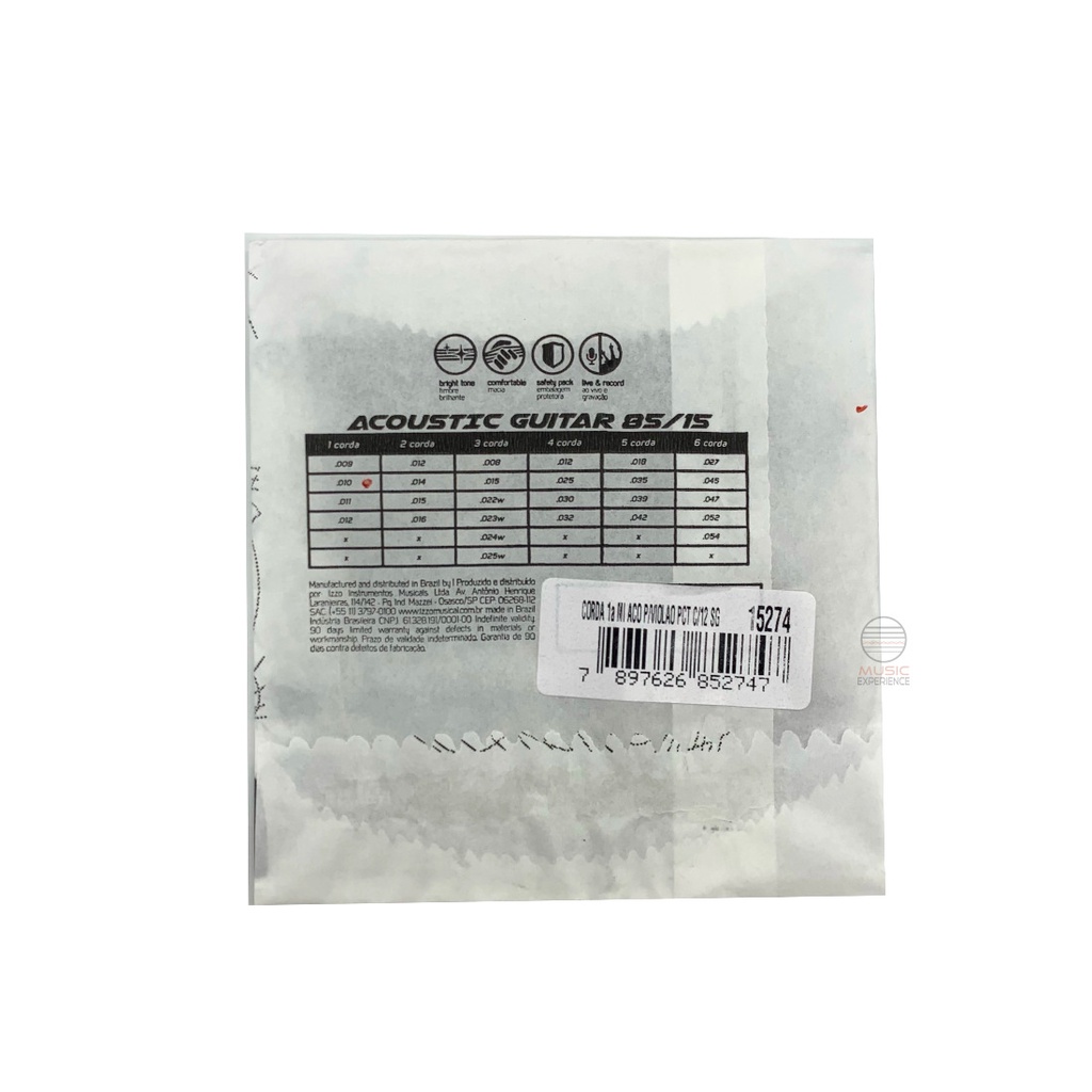 01 Corda avulsa MI violão aço SG primeira corda - 1 unid Conteudo da embalagem: 1 unidade Kit Corda avulsa MI violão aço SG primeira corda - MIZINHA codigo 15274 85/15As cordas avulsas SG podem ser utilizadas como reposição no seu instrumento, e também para criar um "SET" totalmente customizado e exclusivo de cordas na sua guitarra ou no seu violão. Produzidas no Brasil com a mais alta qualidade e para o melhor desempenho.Indicação para utilização: 1ª (primeira) corda mizinhaCalibre Medida da corda: 010Fornecedor: Izzo Instrumentos Musicais (fabricante das cordas SG)