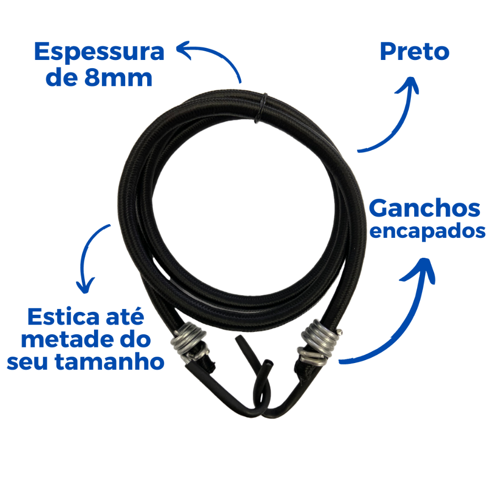 Envio rápido, despachamos seu produto em até 8h úteis; - Resistencia de 7kg; - Estica em até 50% da sua metragem original; - Há mais de 20 anos no mercado; - Ganchos exclusivos Tok Elásticos; - Ideal para ser utilizado em carros, motos, entre outros; - Compre mais de R$79,00 em produtos Tok Elásticos e você recebe frete grátis; INFORMAÇÕES TÉCNICAS Marca: Tok Elásticos Modelo: Elástico Grosso – Gancho de Ferro/Plástico Aplicação: Para fixação de bagageiros e cargas em geral Indicação: Para fixação de bagageiros e cargas em geral Fabricante: Tok Elásticos Material/Composição: Borracha e Polipropileno Conteúdo da embalagem: 01 unidade de Elástico Grosso Dimensões do produto - cm (AxLxP): 05x20x30 Peso líq. aproximado do produto (kg): 1,50 Cores: Preto Espessura: 8mm *Não nos responsabilizamos pelo uso incorreto ou instalação inadequada;