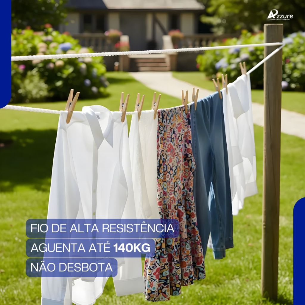 A corda para varal de chão e varal de teto da Azzure é ideal para quem busca um varal forte, que não estraga com o sol e chuva, aguenta até 140kg e apresenta excelente durabilidade. Indicado para varal de parede retratil, varal de chão vertical ou varal de teto. SOBRE A AZZURE A Azzure é fabricante nacional especializada em cordas e redes de alta resistência. Desenvolvemos produtos com excelente acabamento, durabilidade comprovada e ótimo custo-benefício, atendendo todo o Brasil com qualidade, pronta entrega e suporte direto de fábrica. BENEFÍCIOS DO PRODUTO – Alta resistência e durabilidade . – Aguenta até 140kg sem arrebentar. – Tratamento contra raios ultravioleta, ideal para uso em áreas externas. – Flexível, leve e de fácil manuseio. – Resistente a sol, chuva e umidade. – Fácil instalação e manuseio. – Produto direto do fabricante. – Excelente custo-benefício. FICHA TÉCNICA – Produto: corda para varal. – Modelo: Fio trançado com alma. – Material: Alma 100% polipropileno e capa 100% polipropileno. – Espessura / Diâmetro / Medida: 3mm. – Carga de ruptura / Resistência: 140kg. – Indicação de uso: Varal de chão, varal retrátil, varal de teto, varal de roupa. – Não indicada para esportes radicais ou atividades que envolvam risco à vida. O QUE VAI NO PACOTE – 1 rolo de 1kg com aproximadamente 205m de corda. GARANTIA E ENVIO – Produto com envio rápido. – Pronta entrega. – Garantia contra defeito de fabricação. PALAVRAS-CHAVE varal de chao, varal retratil, varal de teto, varal de parede, varal de roupa, varal de chao 3 andares, varal chao grande, varal de parede retratil, varal de apartamento, varal retratil chao, varal magico, varal de chao aluminio, varal articulado para parede, varal de chao vertical