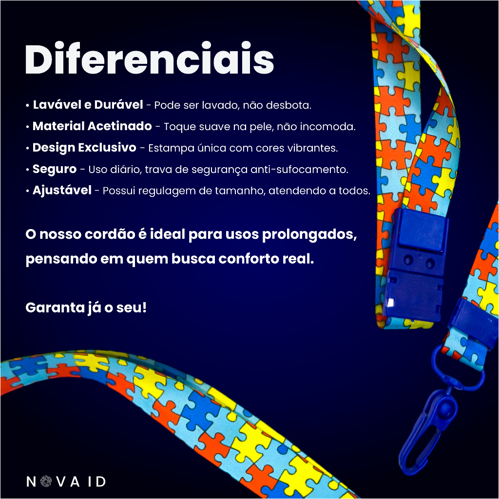 Nosso kit é composto por: • 01 Cordão Autista Quebra-cabeça com Trava de Segurança. • 01 Pulseira Autista • 01 Porta Crachá de Plástico Cordão quebra-cabeça para autistas com fecho de segurança produzido pela Nova ID. O cordão autista ajuda na identificação de indivíduos dentro do espectro, facilitando seu acesso aos seus diversos direitos como pessoas com deficiência. Produzido em material acetinado e finalizado com elementos de plástico. Conta com uma trava de segurança anti-sufocamento, sendo confortável e seguro para o seu usuário. De acordo com a Lei 12764 § 2º A pessoa com transtorno do espectro autista é considerada pessoa com deficiência, para todos os efeitos legais. Especificações: • Medida Cordão: 89 x 2 cm (comprimento x largura - aberto) Tamanho Ajustável O cordão ajuda na identificação, mas não substitui documentos. Ainda lhe pode ser requerido a apresentação de um documento de comprovação oficial quando necessário. Nosso horário de atendimento humano é das 08h às 18h, de Segunda a Sexta. Nos finais de semana, estamos disponíveis para tirar dúvidas. Envio rápido e garantido! Conte conosco! Nova ID, identificação que conecta.