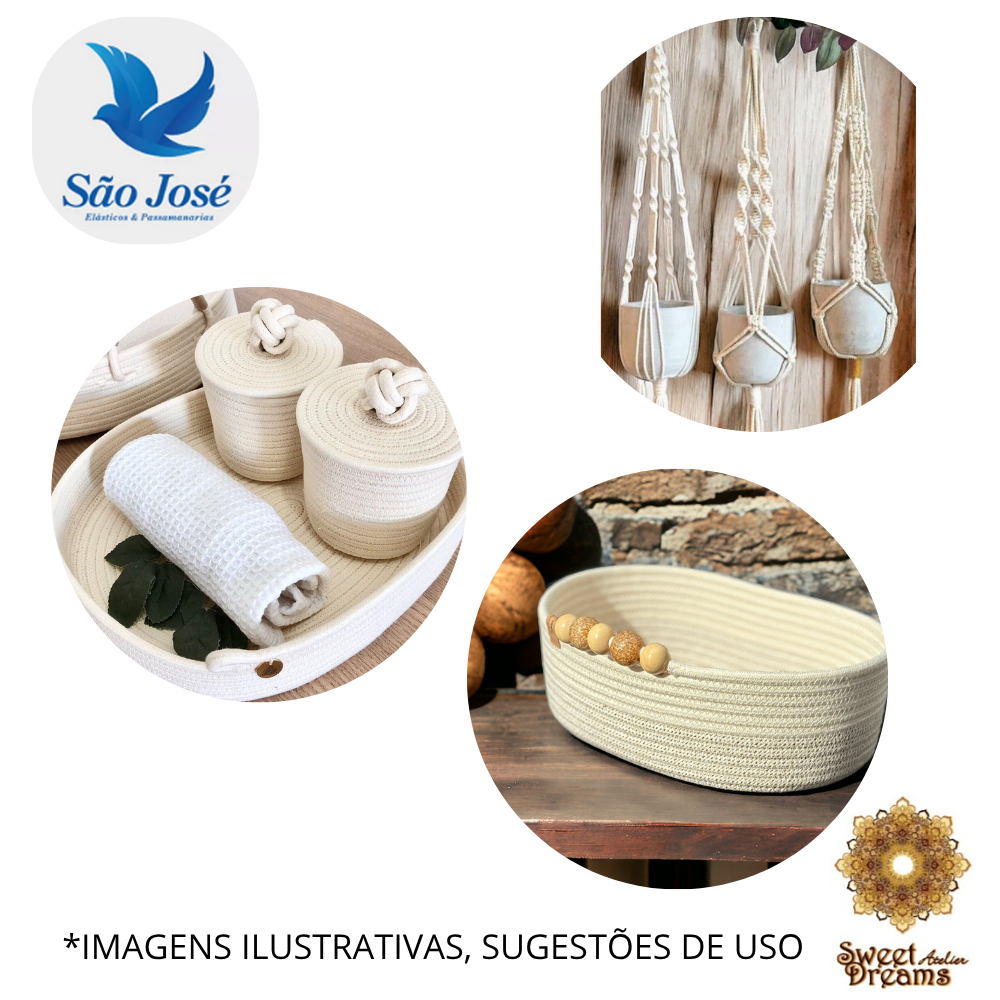 Cordão Trançado São José Cru Contém: 1 rolo com 50 metros Composição: 100% Algodão Possui preenchimento (alma). Cordão para trabalhos de artesanatos como suportes pendentes de vasos em macramê, bolsas, tricô, crochê, tapetes e etc... Fabricante: Elásticos São José