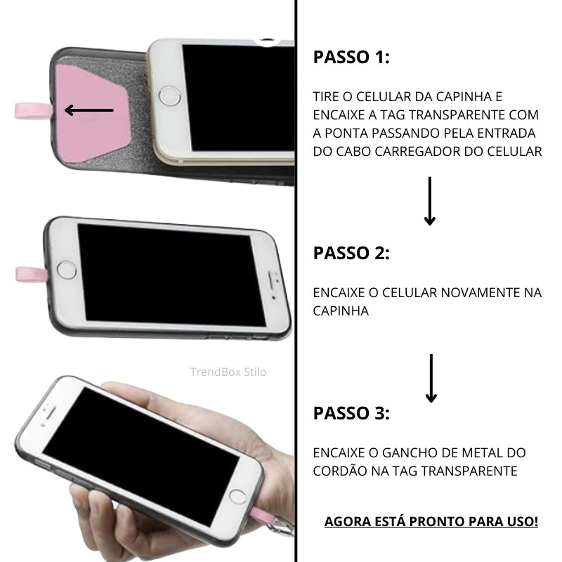 Cordão de Celular Ajustável Alça Anti Furto Para Celular Modelo Universal Evite quedas, furtos e acidentes com seu celular usando o cordão antifurto para celular, um acessório prático, discreto e indispensável para quem quer mobilidade com segurança no dia a dia. Ideal para uso em viagens, shows, eventos, trabalho, academia, caminhadas, transporte público ou rotina urbana. 🚚 Envio Rápido Postagem em até 24h úteis após a confirmação do pedido Produto a pronta entrega. Medidas e Dimensões - Comprimento total do cordão: aproximadamente 70 cm - Ajuste de altura: alça regulável para uso no pescoço ou transversal - Tag transparente: tamanho fino e discreto, não interfere no uso do celular nem no carregamento Compatibilidade Compatível com a maioria dos smartphones, desde que a capinha possua abertura inferior para o carregador. ⚠ Atenção: - Não acompanha capinha - Funciona com capinhas fechadas - Não é compatível com capinhas abertas ou tipo carteira Como Usar (Rápido e Simples) - Passo 1: Retire o celular da capinha - Passo 2: Encaixe a tag transparente pela entrada do carregador - Passo 3: Recoloque o celular na capinha - Passo 4: Prenda o gancho de metal do cordão na tag 👉 Pronto! Seu celular já estará seguro para uso. 📦 Conteúdo da Embalagem - 1 cordão antifurto com alça regulável - 1 tag transparente de fixação 🧵 Materiais de Cada Componente Alça / Cordão: ✔ Nylon resistente e flexível ✔ Confortável ao toque, não machuca o pescoço ou ombro Fecho: ✔ Metal de alta resistência ✔ Trava segura, ideal para uso diário Extremidades do cordão: ✔ Acabamento em metal ✔ Maior durabilidade e reforço estrutural Tag transparente: ✔ Material plástico flexível e resistente ✔ Fina, discreta e praticamente invisível quando instalada ✔ Não risca o aparelho e não bloqueia a entrada do carregador