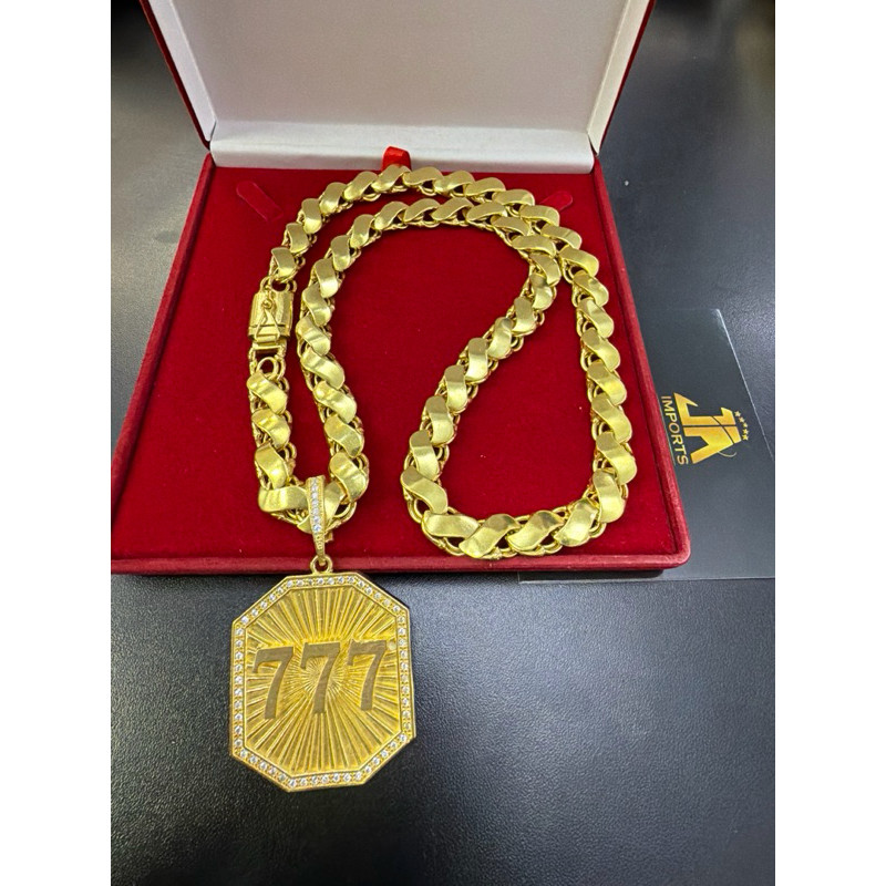 Cordão friso s 12mm 70cm + pingente 777 moeda antiga
