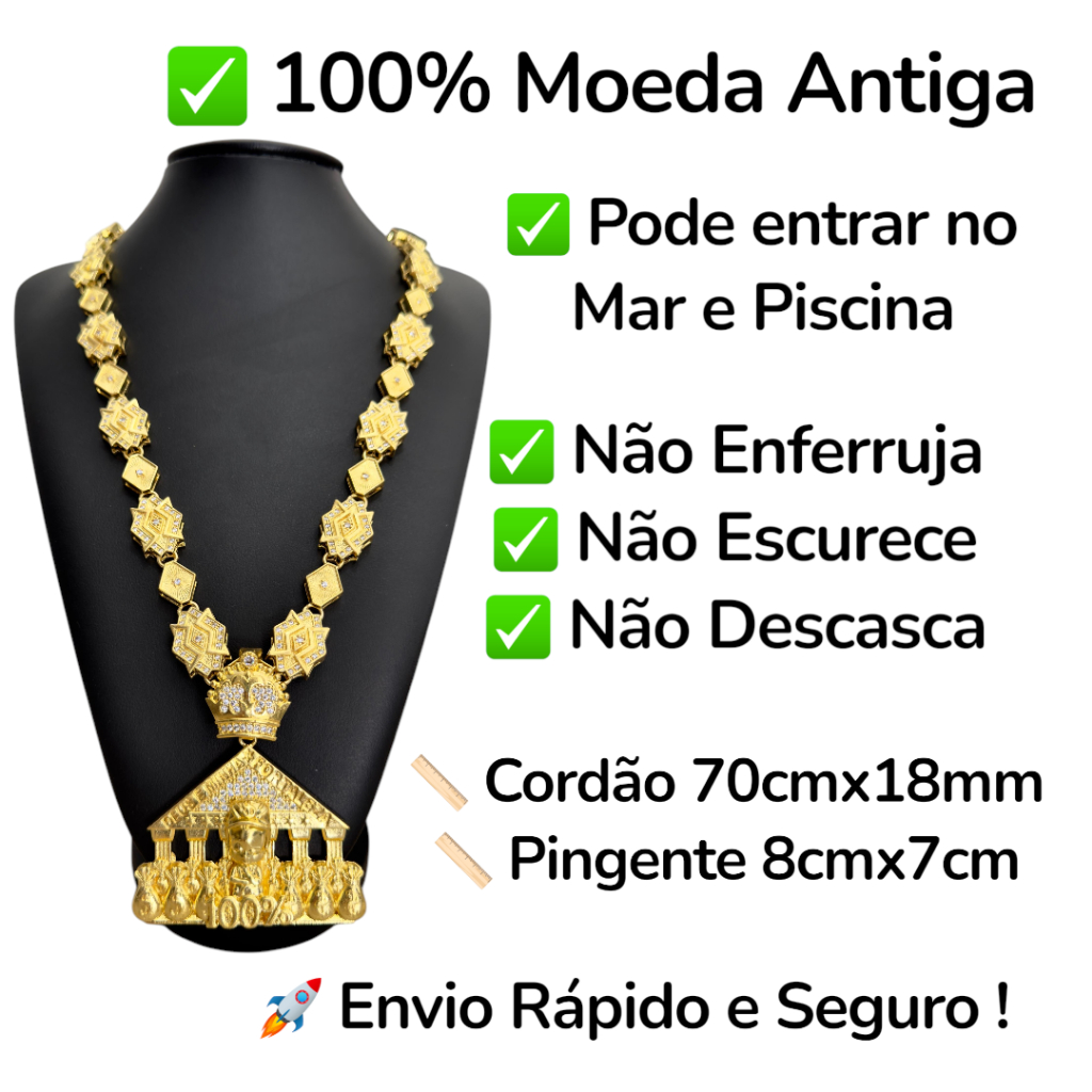ESPECIFICAÇÕES: - Modelo: Cordão Gladiador com Pingente Chefinho 100% Deus É Minha Fortaleza Cravejado - Comprimento do cordão: 70cm - Pingente: 8cm x 7cm - Material: 100% Moeda Antiga – brilho duradouro e resistência - Acompanha: Limpa Joias 50 ML CONHEÇA A PRECIOSO IMPORTS 18K: - Tradição no ramo das joias - Melhor preço do Brasil - Acabamento premium com altíssima qualidade - Resistente à água – ideal para o uso diário - Envio rápido e seguro para todo o país - Todas as peças passam por revisão antes do envio CUIDADOS COM A SUA JOIA: - Limpeza: Usar sabão, detergente neutro ou pasta de dente, seque bem e guarde corretamente - Limpeza profunda: Utilize nosso limpa joias, seguindo as instruções
