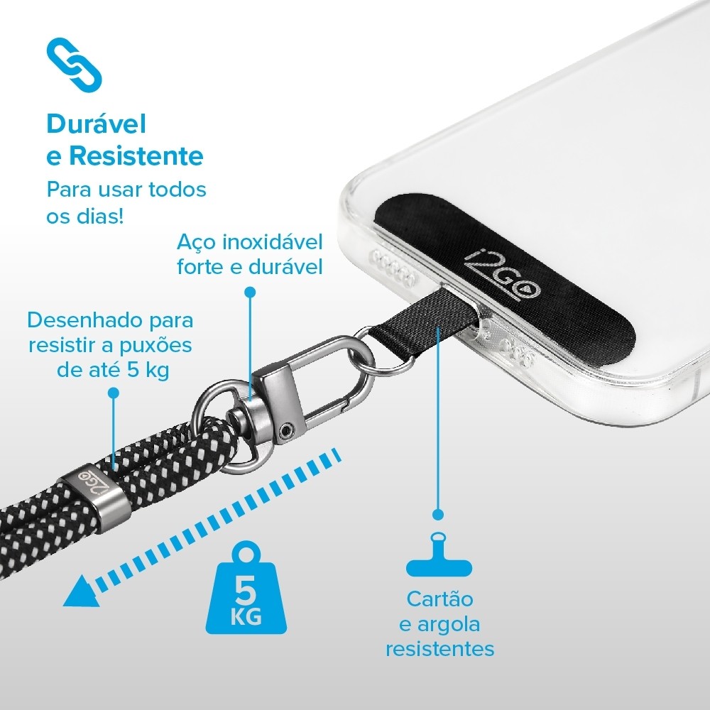 O cordão para smartphone é um acessório prático e estiloso, projetado para facilitar o transporte e a segurança do seu dispositivo. O cordão não apenas oferecem uma solução prática para carregar seu dispositivo, mas também adicionam um toque de estilo ao seu visual. Segurança: Os cordões ajudam a prevenir quedas acidentais do celular, proporcionando uma camada extra de proteção. Isso é especialmente útil em situações onde o risco de queda é maior, como durante atividades físicas ou em ambientes movimentados. Acesso Rápido: Com o cordão preso ao corpo, o usuário tem acesso imediato ao smartphone, facilitando a utilização do dispositivo em momentos em que é necessário ter as mãos livres, como em eventos ou durante viagens. Versatilidade: Possuem alças ajustáveis, permitindo que sejam usados como colares ou sobre o ombro, adaptando-se às suas necessidades diárias. Estilo e Beleza: Os Cordões oferecem uma combinação de beleza e praticidade, tornando-se um acessório essencial para quem busca elegância. Fácil Instalação: É compatível com diversas capas e pode ser facilmente fixada, tornando o uso simples e sem complicações. Especificações Técnicas: Material: Nylon + Aço Inox + Cartão TPU Comprimento do cabo: Comprimento 160cm Comprimento ajustável: 75-130cm OD para cabo: 0.6mm Tamanho do cartão: 55x35mm Suporte de carga: Max 5KG Certificação: ROHS Peso: 40.1g Acessórios: Cordão + Laço de silicone branco *Garantia i2GO: Esse produto está garantido contra defeitos de fabricação por 1 ano.