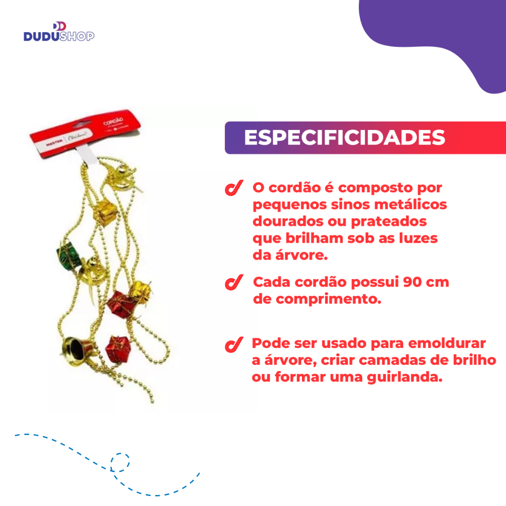 O Cordão para Árvore de Natal Sino é uma decoração encantadora que traz um toque de elegância e tradição à sua árvore natalina. Com detalhes delicados, o cordão é composto por pequenos sinos metálicos, dourados ou prateados, que cintilam suavemente sob as luzes da árvore. Ele pode ser usado para emoldurar a árvore, adicionar camadas de brilho ou até mesmo para criar uma linda guirlanda. Ideal para quem busca um enfeite clássico e sofisticado, o cordão de sinos é perfeito para complementar o ambiente festivo, evocando a magia do Natal e o som suave da alegria. Cordão 90cm cada ATENÇÃO: AS CORES PODEM VARIAR ENTRE DOURADO E PRATA!