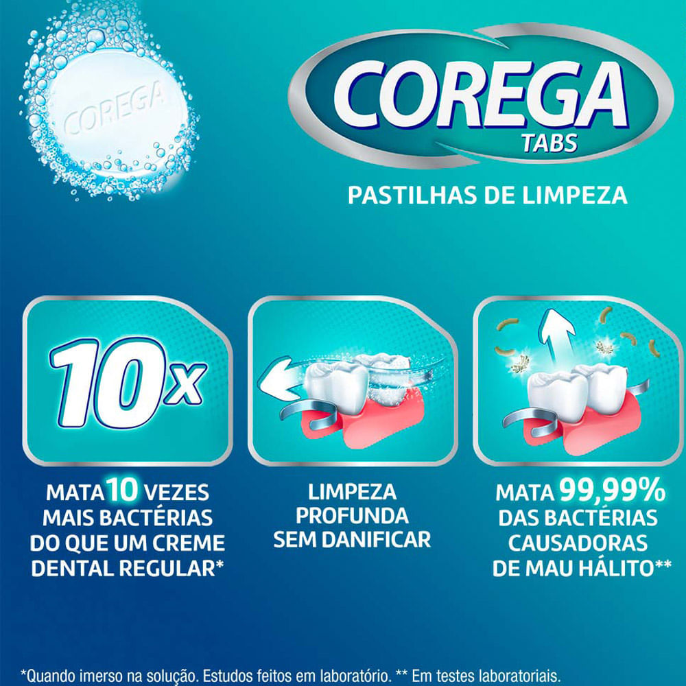 Corega Tabs Branqueador 6 Pastilhas Para aqueles que procuram uma limpeza profunda em aparelhos removíveis, aparelhos ortodônticos, dentaduras, protetores bucais e próteses dentárias, Corega Tabs é a