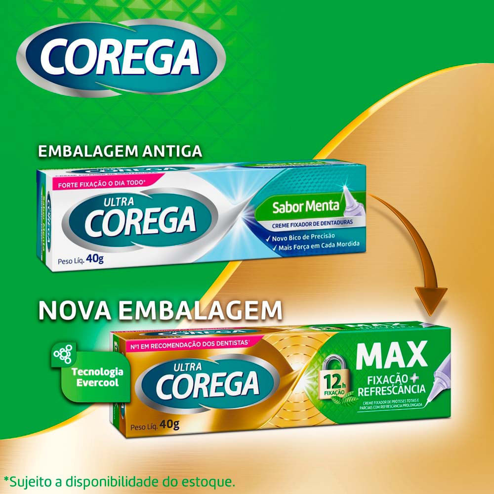 Ultra Corega Creme Max Fixação + Refrescância Sabor Menta – Fixador de prótese 40g Aproveite o prazer de comer o que quiser. Corega Max Fixação + Refrescância possui fixação mais forte* e bloqueia até