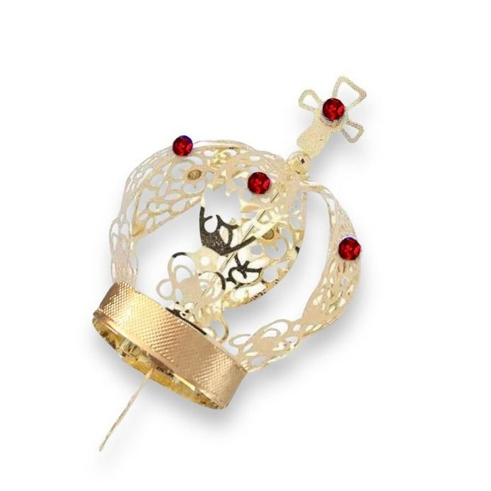 Coroa modelo N°4, em metal dourado com acabamento brilhante, adornada com pedras azuis ou vermelhas, ideal para imagens sacras de até 30cm. Perfeita para altares, capelas, oratórios e lembrancinhas religiosas, conferindo destaque e beleza à sua devoção. ✔️ Modelo N°4 – tamanho ideal para imagens de até 30cm ✔️ Pedras decorativas em azul ou vermelho ✔️ Acabamento dourado resistente e elegante ✔️ Valoriza e destaca sua imagem sacra